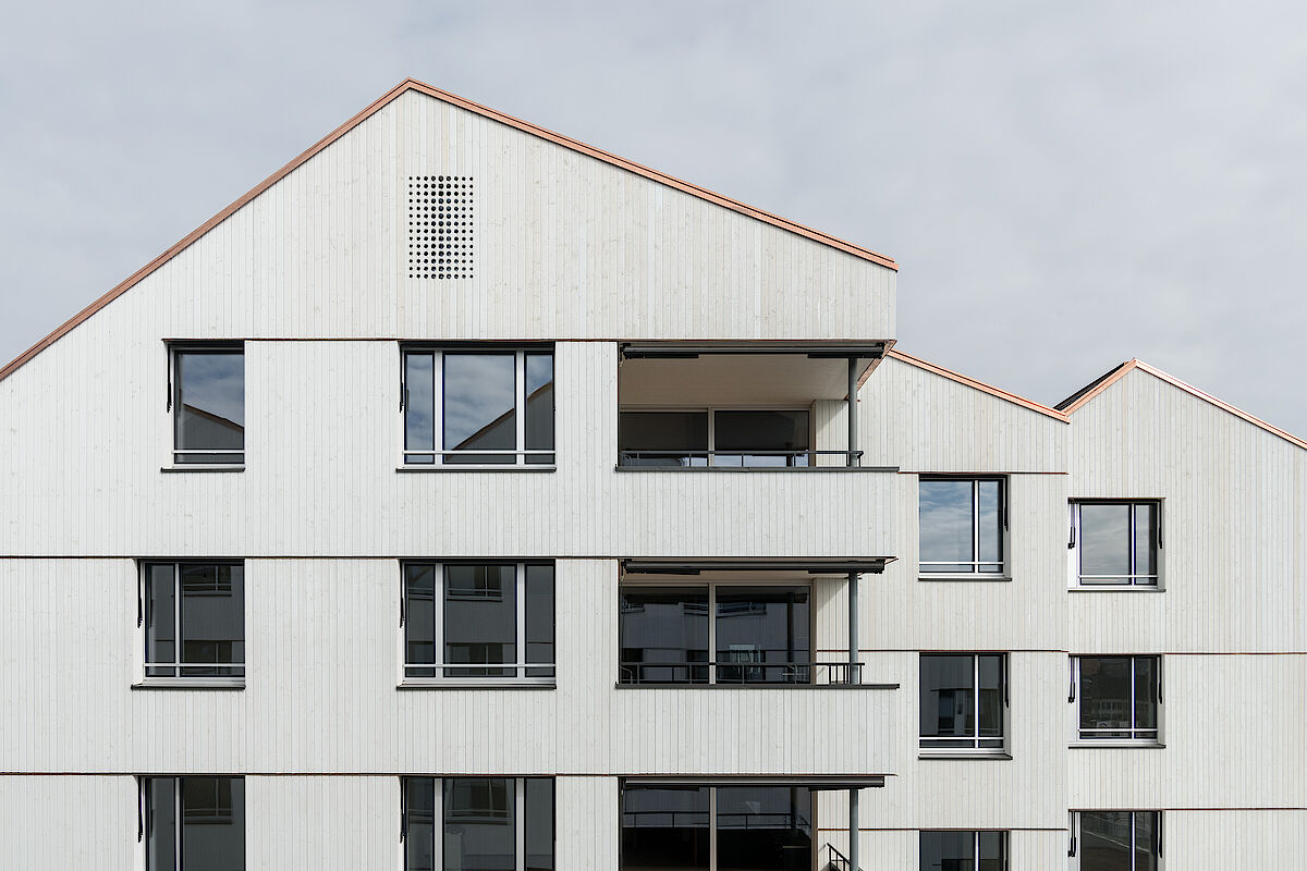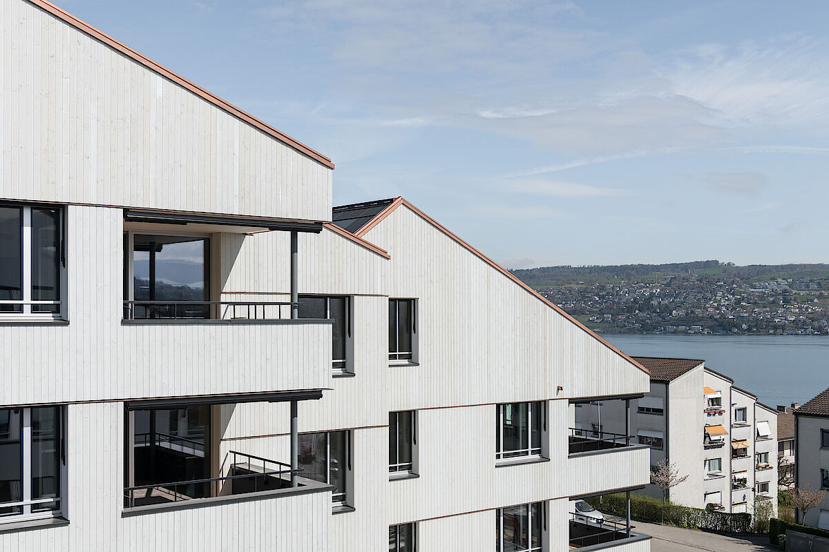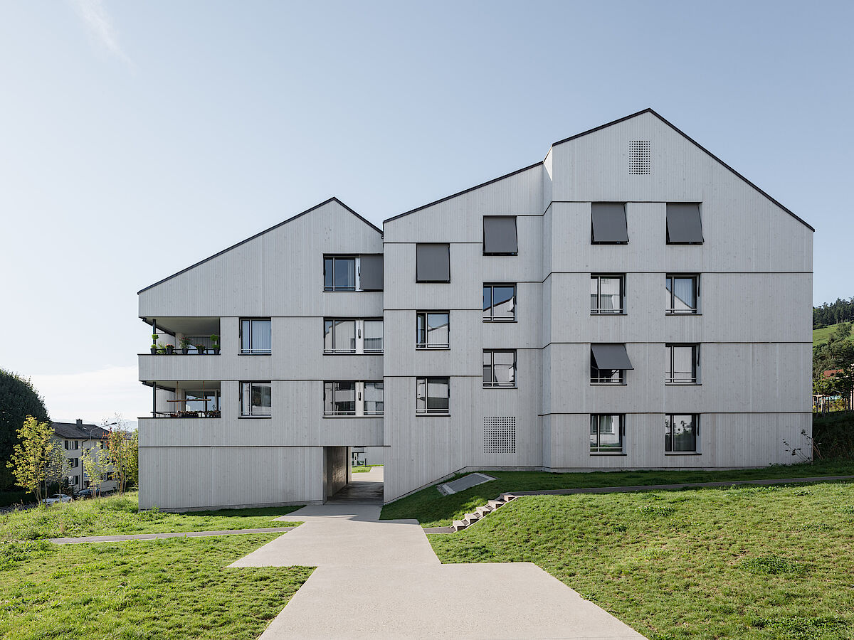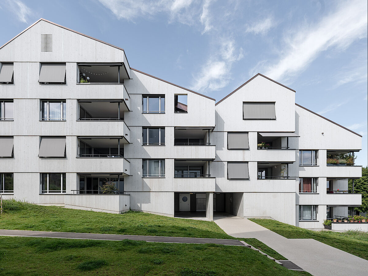 Drei längliche Baukörper bilden das in den abfallenden Hang eingebettete Ensemble der Wohnsiedlung Büehlhalden. Die fein abgestuften Gebäudefiguren passen sich der Körnigkeit des Kontextes an und bewahren damit die quartiertypische Transparenz. Ihre Gebäudesilhouetten zeichnen die Hügelkonturen nach. Die zwei- bis dreigeschossigen Volumen mit Dachgeschoss sind unterschiedlich gross und in ihrer Grundfigur verschieden. An- und Aufsicht der Volumina sind gestaffelt und so zu einer Einheit verbunden. Dies kommt den Wohnungen zugute, die dadurch mehrseitig orientiert sind. Der beidseitig öffenbare Gemeinschaftsraum liegt im Herzen der Anlage. Bauen am Hang ist eine besondere Herausforderung – insbesondere, wenn Aussicht und Sonne in entgegengesetzte Richtungen zeigen. Deshalb ist der Wohnraum um eine Loggia gelegt und geht mit ihr eine räumliche Symbiose ein.