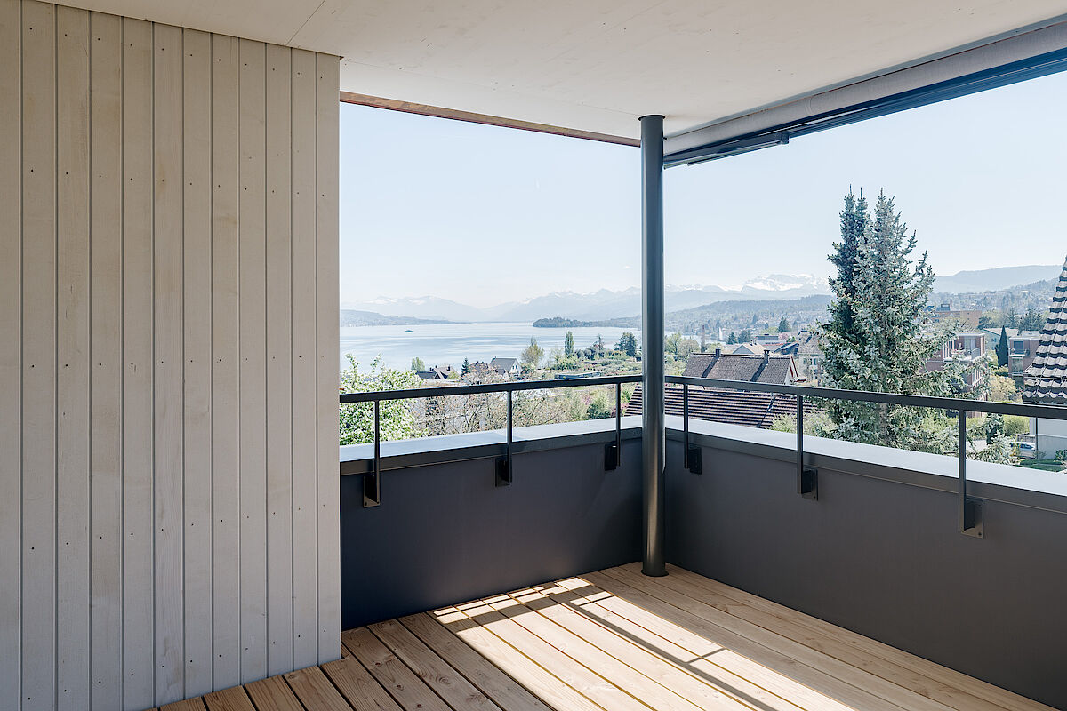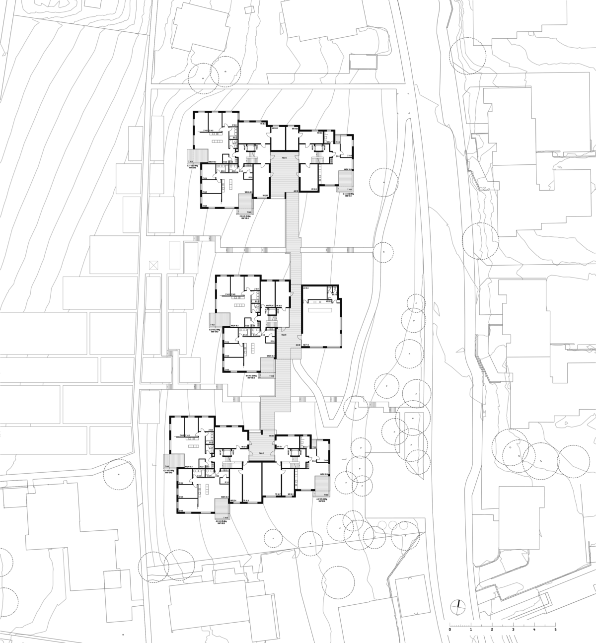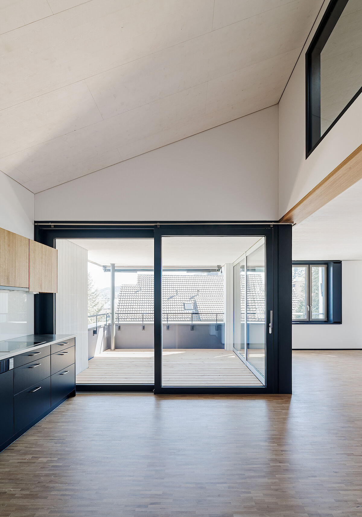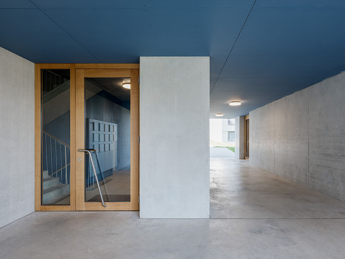 Drei längliche Baukörper bilden das in den abfallenden Hang eingebettete Ensemble der Wohnsiedlung Büehlhalden. Die fein abgestuften Gebäudefiguren passen sich der Körnigkeit des Kontextes an und bewahren damit die quartiertypische Transparenz. Ihre Gebäudesilhouetten zeichnen die Hügelkonturen nach. Die zwei- bis dreigeschossigen Volumen mit Dachgeschoss sind unterschiedlich gross und in ihrer Grundfigur verschieden. An- und Aufsicht der Volumina sind gestaffelt und so zu einer Einheit verbunden. Dies kommt den Wohnungen zugute, die dadurch mehrseitig orientiert sind. Der beidseitig öffenbare Gemeinschaftsraum liegt im Herzen der Anlage. Bauen am Hang ist eine besondere Herausforderung – insbesondere, wenn Aussicht und Sonne in entgegengesetzte Richtungen zeigen. Deshalb ist der Wohnraum um eine Loggia gelegt und geht mit ihr eine räumliche Symbiose ein.
