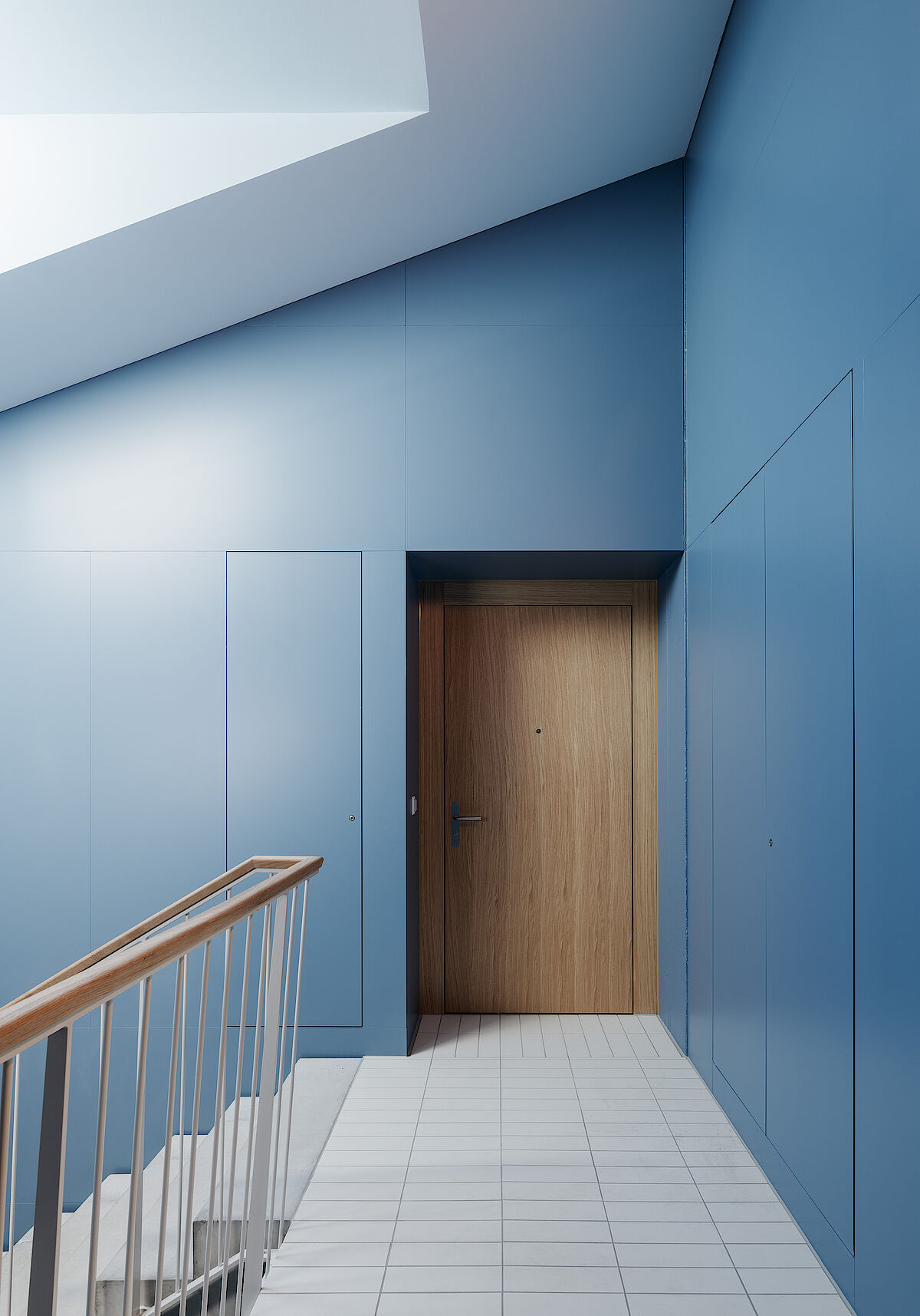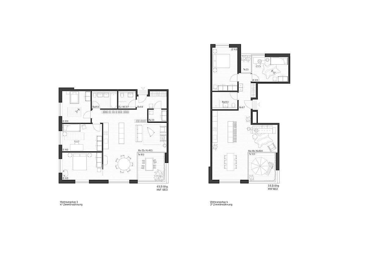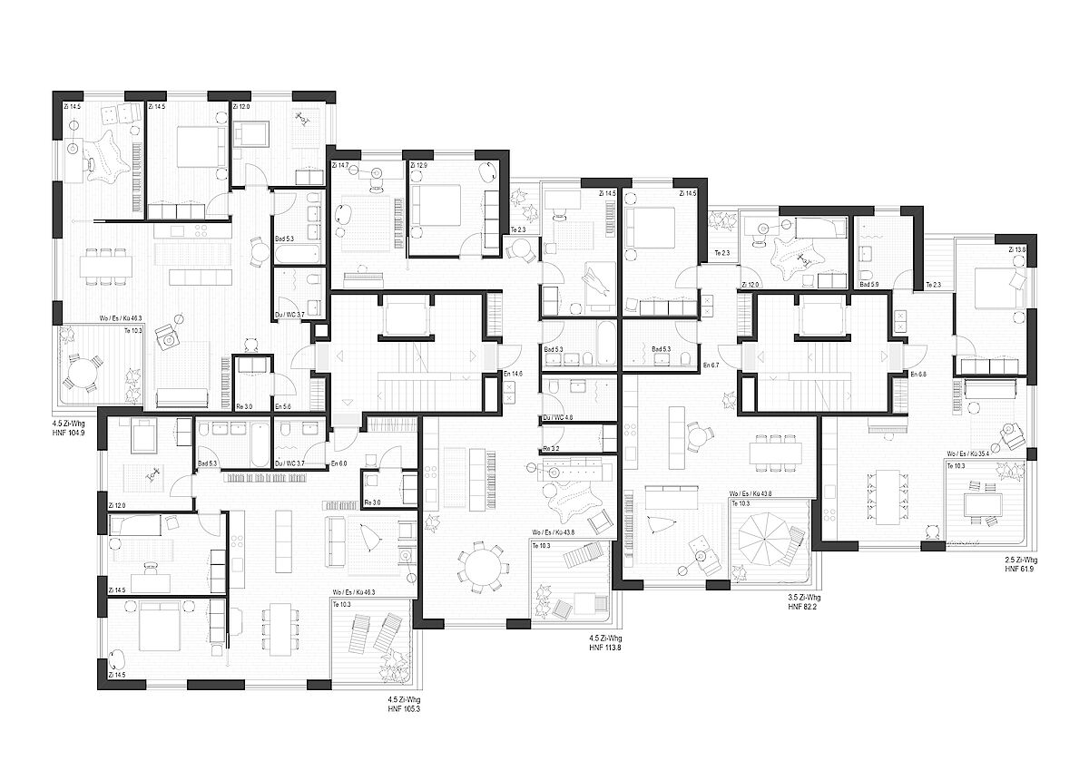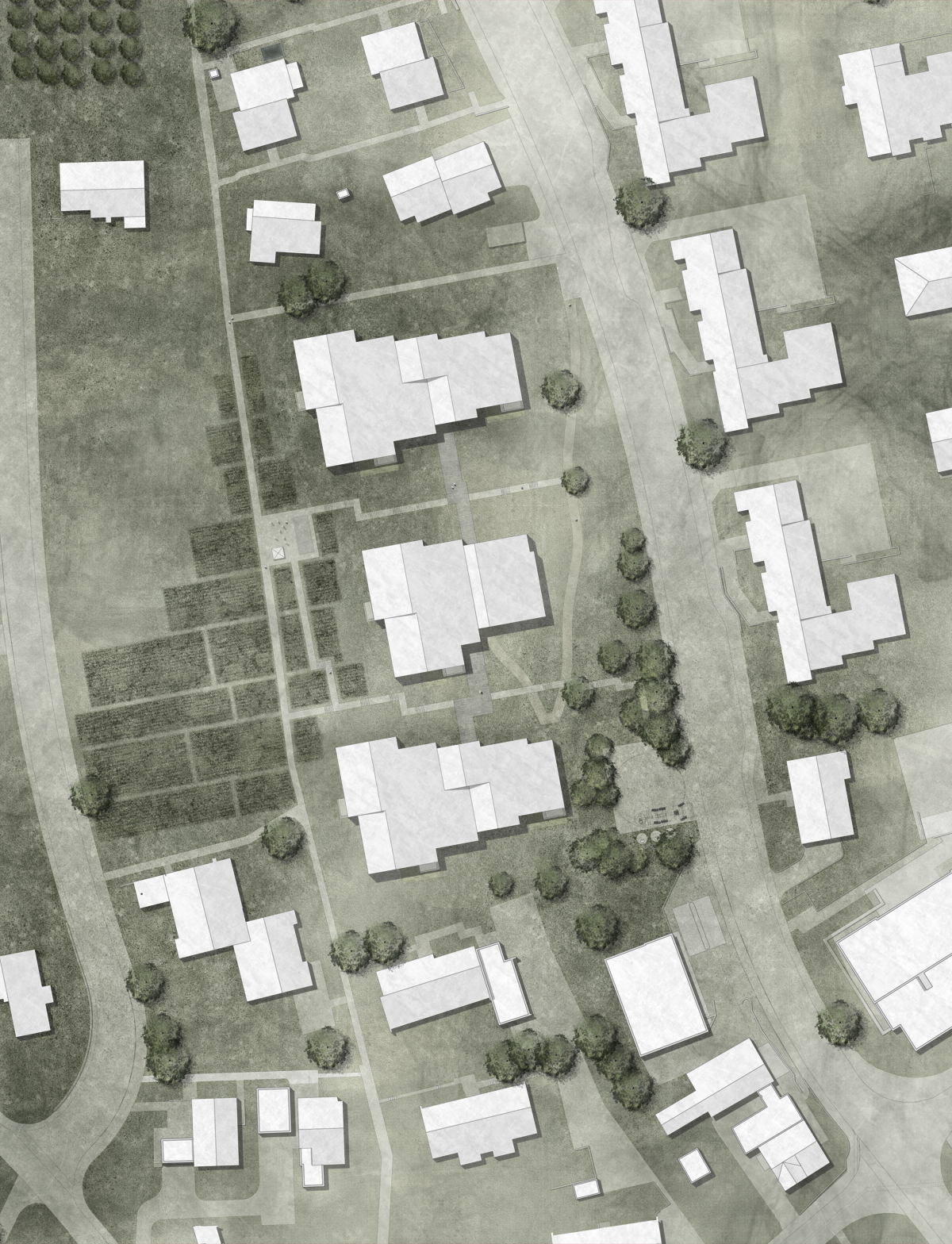 Drei längliche Baukörper bilden das in den abfallenden Hang eingebettete Ensemble der Wohnsiedlung Büehlhalden. Die fein abgestuften Gebäudefiguren passen sich der Körnigkeit des Kontextes an und bewahren damit die quartiertypische Transparenz. Ihre Gebäudesilhouetten zeichnen die Hügelkonturen nach. Die zwei- bis dreigeschossigen Volumen mit Dachgeschoss sind unterschiedlich gross und in ihrer Grundfigur verschieden. An- und Aufsicht der Volumina sind gestaffelt und so zu einer Einheit verbunden. Dies kommt den Wohnungen zugute, die dadurch mehrseitig orientiert sind. Der beidseitig öffenbare Gemeinschaftsraum liegt im Herzen der Anlage. Bauen am Hang ist eine besondere Herausforderung – insbesondere, wenn Aussicht und Sonne in entgegengesetzte Richtungen zeigen. Deshalb ist der Wohnraum um eine Loggia gelegt und geht mit ihr eine räumliche Symbiose ein.