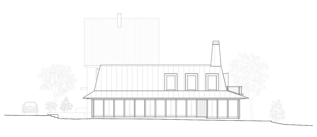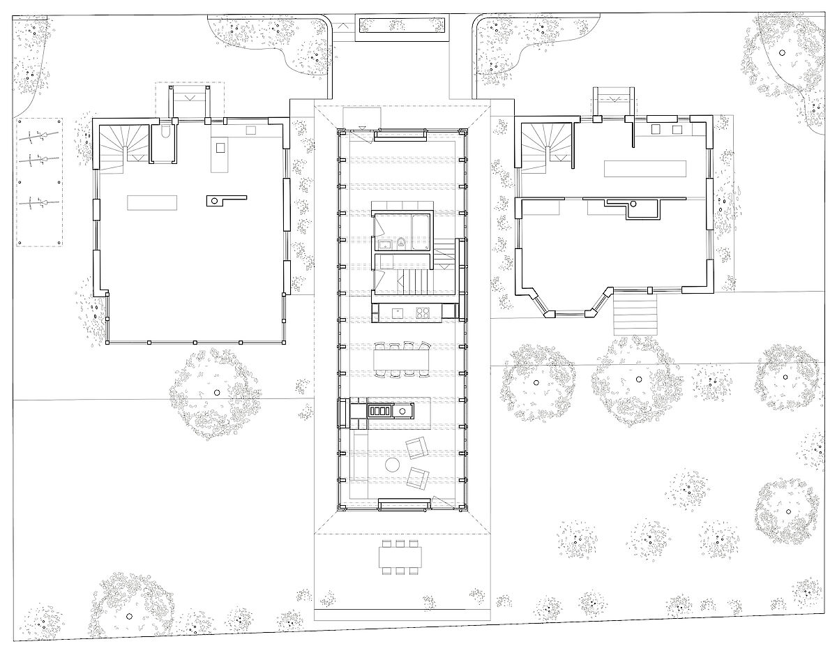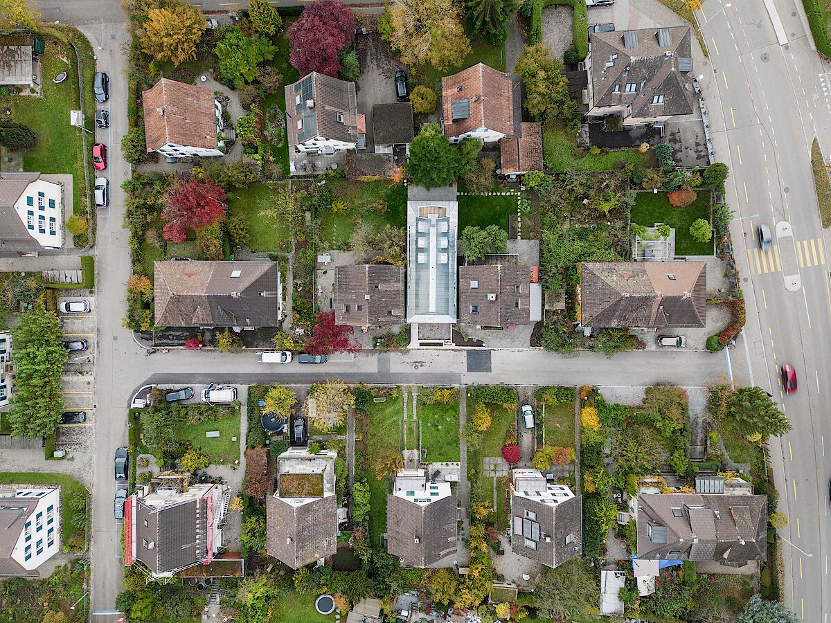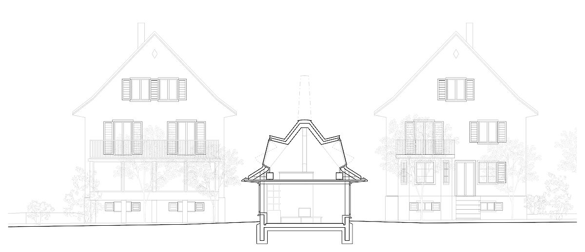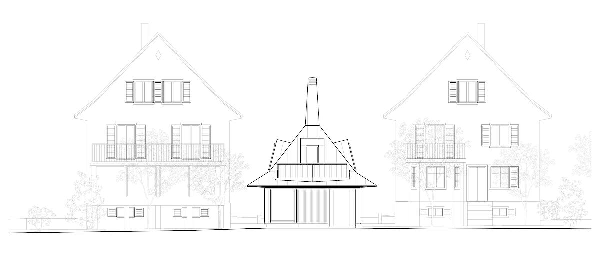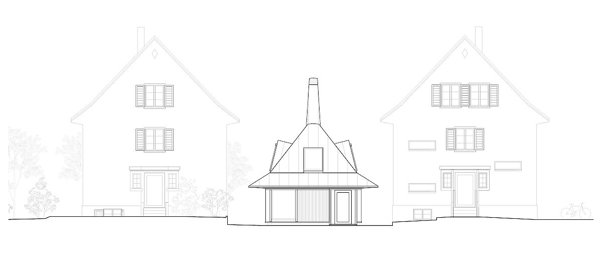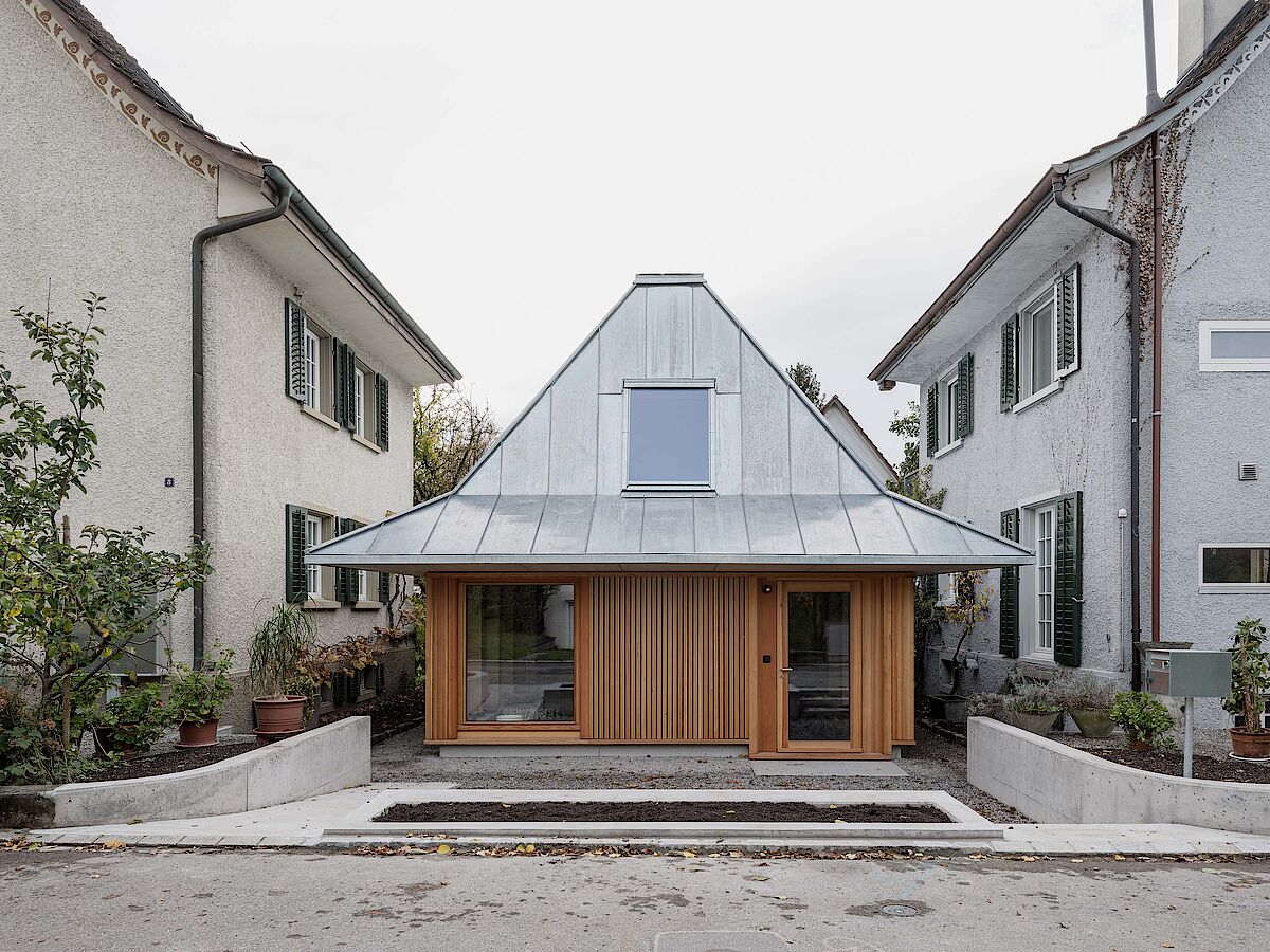 Die Bauherrschaft hatte klare Vorstellungen. Zwei bestehende Einfamilienhäuser in einem Wohnquartier aus den 1920-er Jahren mussten erhalten bleiben, und mit der Ausnützungsreserve sollte eine dritte Wohneinheit erstellt werden. Möglich wurde dies durch das Zusammenlegen beider Grundstücke. Das eingeschossige neue Wohnhaus mit langgezogenem Dachhut aus Zink situiert sich geduckt zwischen die beiden Altbauliegenschaften, und verdichtet die regelmässig angeordnete Einfamilien- und Doppelhausstruktur des Quartiers auf der Hangkante oberhalb des Spitals Uster. Im Gegensatz zu den verputzten Wohnhäusern mit Hochparterre steht das neue in Holzelementbauweise ausgeführte Haus direkt im Terrain und in engem Bezug zum umliegenden Garten.
