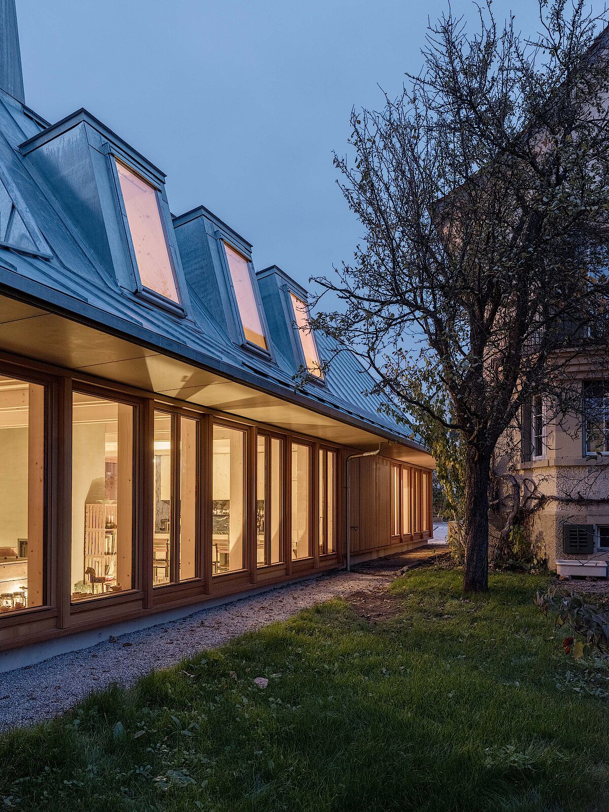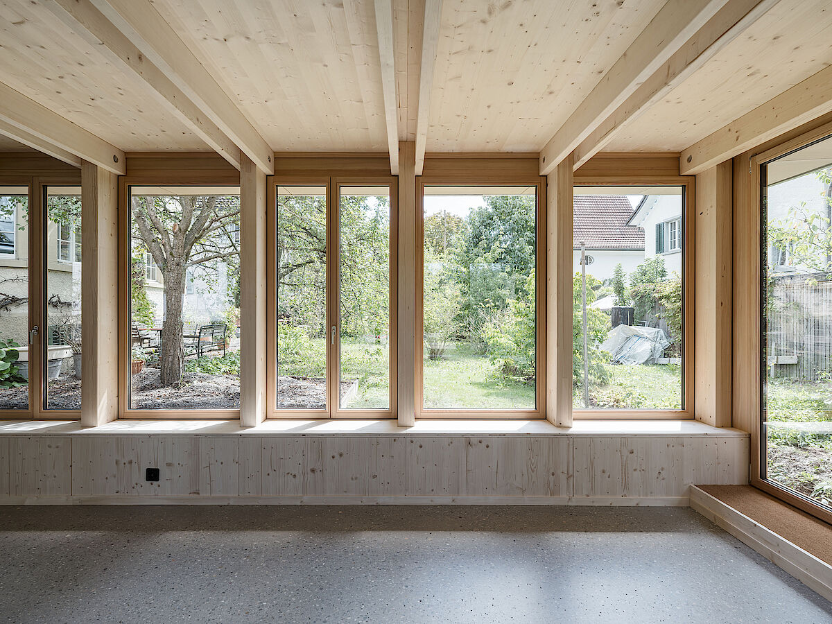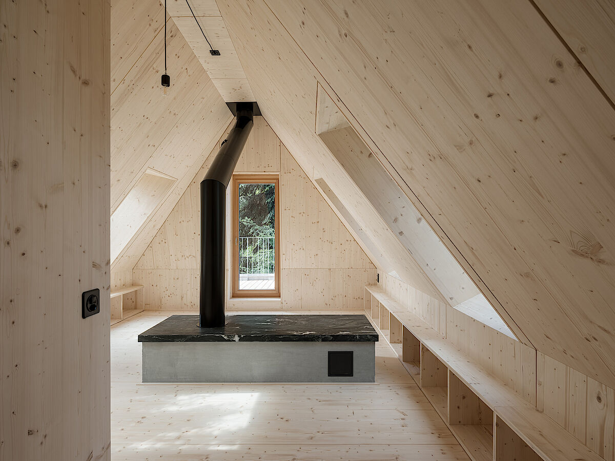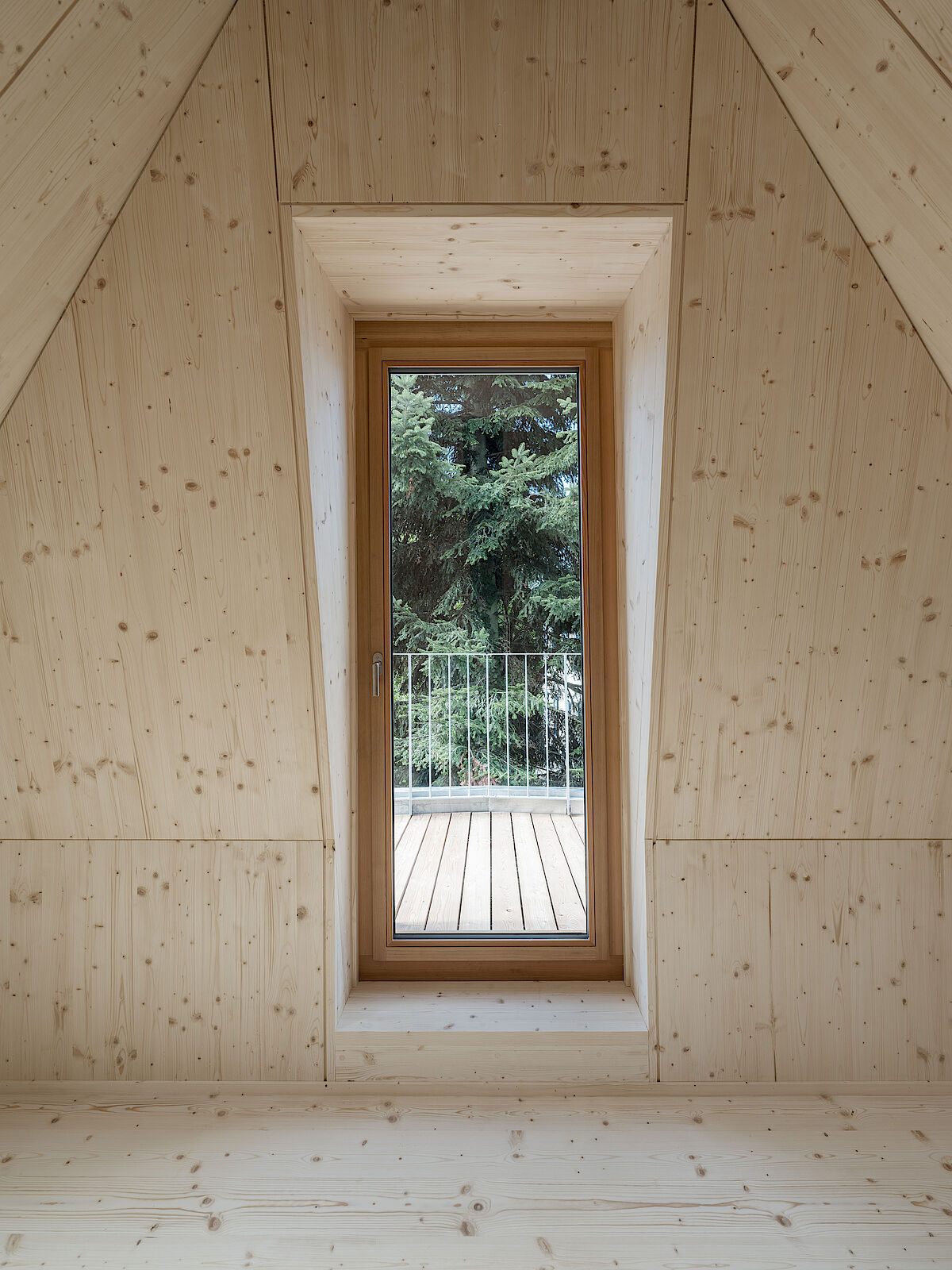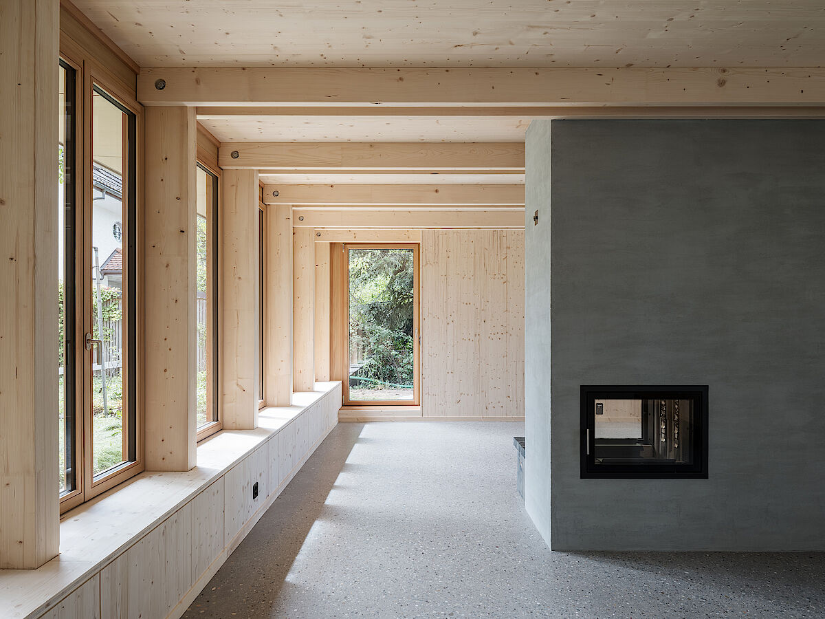 Der allseitig über Lärchenfenster belichtete Wohnraum findet seinen Rückhalt in einem möbelartigen, mit Lehm verputzten Holzspeicherofen. Zur räumlichen Offenheit des Erdgeschosses entfaltet das Dachgeschoss gegensätzliche Eigenschaften. Als Rückzugsraum ist der Schlaf- und Arbeitsbereich vollständig mit Fichtenholz ausgekleidet. Unerwartet gewährt die kleine Dachterrasse einen neuen Blick in das durchgrünte Wohnquartier.