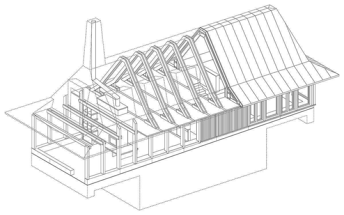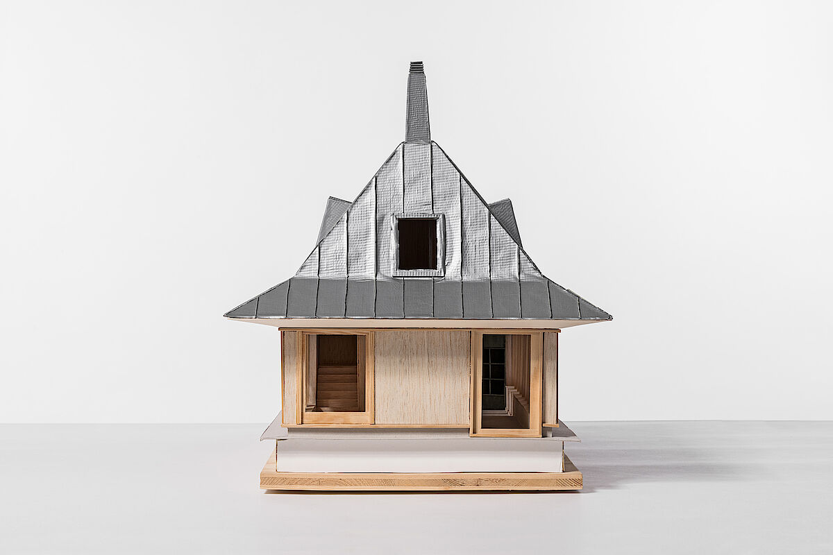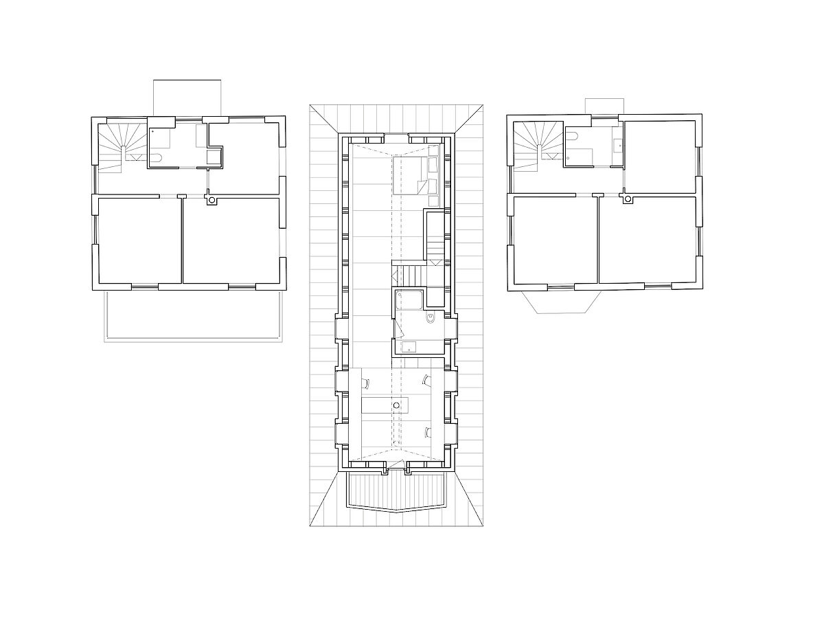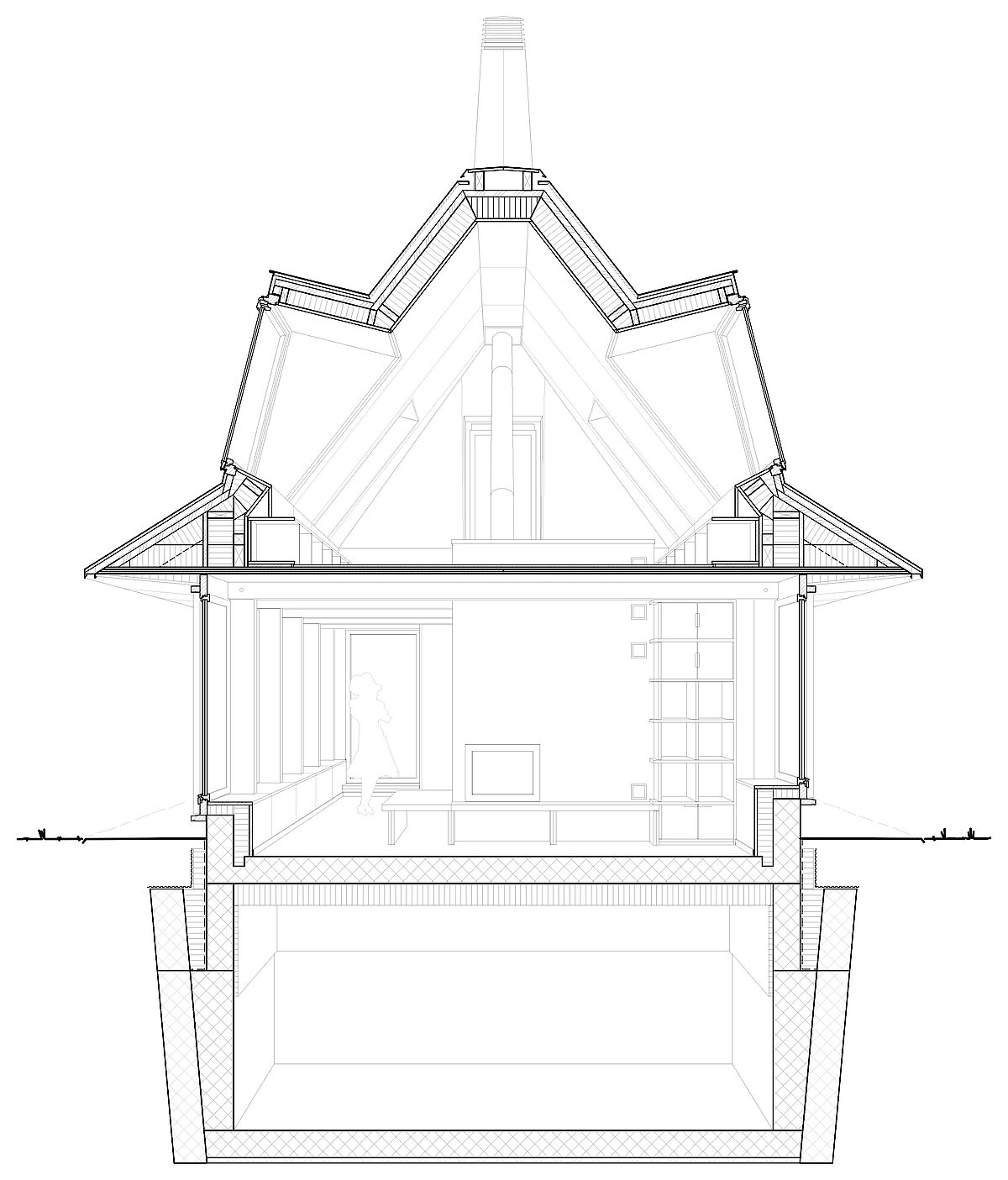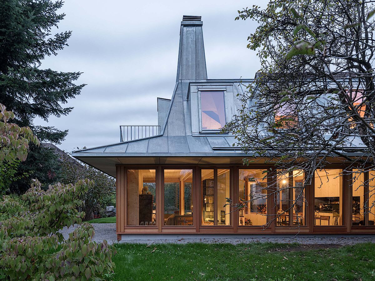 Der allseitig über Lärchenfenster belichtete Wohnraum findet seinen Rückhalt in einem möbelartigen, mit Lehm verputzten Holzspeicherofen. Zur räumlichen Offenheit des Erdgeschosses entfaltet das Dachgeschoss gegensätzliche Eigenschaften. Als Rückzugsraum ist der Schlaf- und Arbeitsbereich vollständig mit Fichtenholz ausgekleidet. Unerwartet gewährt die kleine Dachterrasse einen neuen Blick in das durchgrünte Wohnquartier.