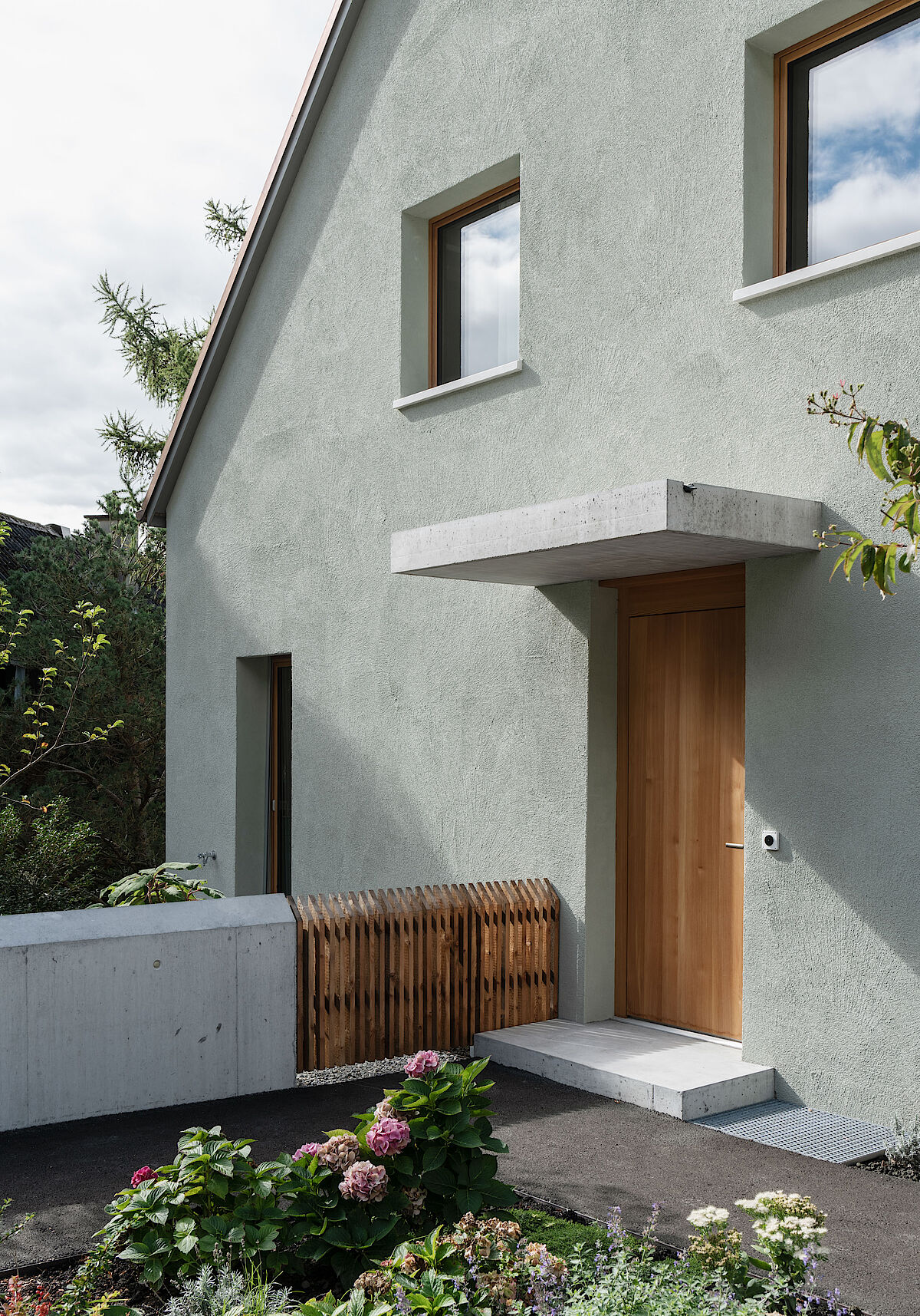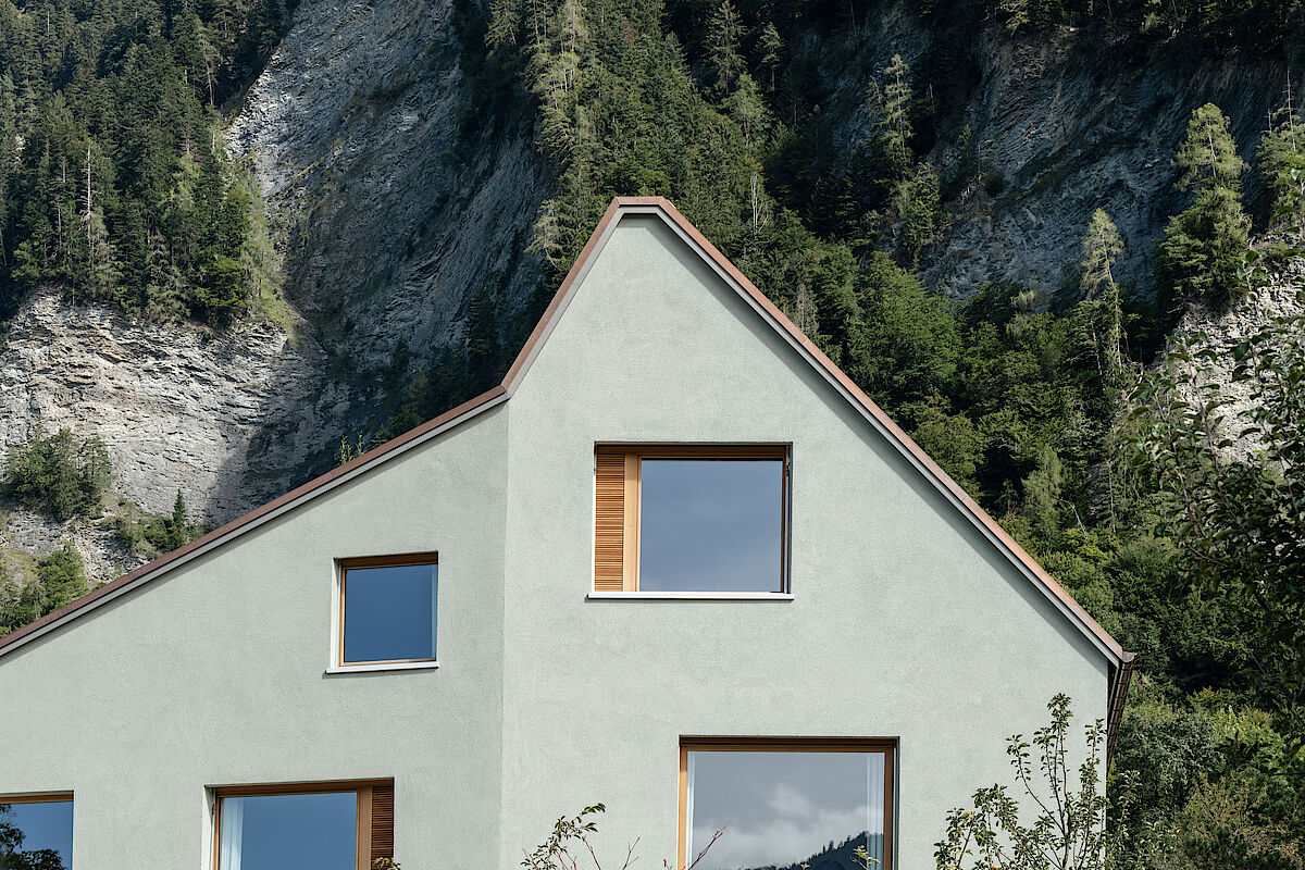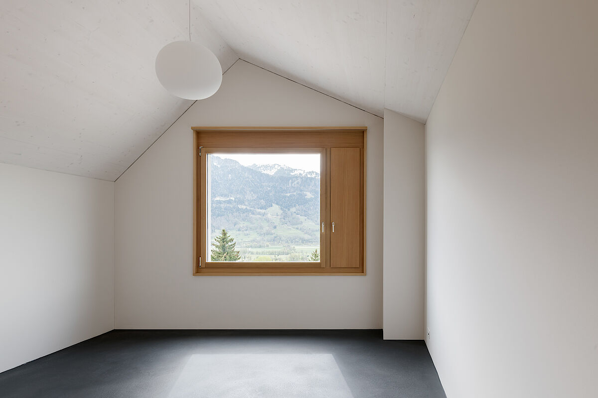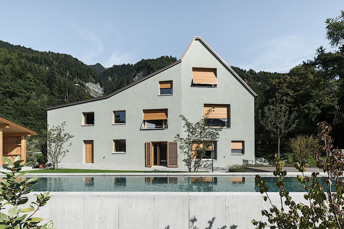 Am südlichen Dorfrand von Jenins gelegen, reiht sich das Wohnhaus selbstverständlich in die morphologische Dorfstruktur ein. Sämtliche Haupträume verfügen über einen malerischen Blick in die beeindruckende Landschaft. Die Hauptfassade wird durch eine leichte Abknickung gegliedert. Diese Massnahme ermöglicht Ausblicke aus dem Ess- und Wohnbereich Richtung Haldensteiner Calanda oder in die nahe gelegenen Rebhänge. Gleichzeitig verweist der Knick auch auf das Cheminée im Innern, welches mit der Fassade und dem ikonografischen Dach verschmilzt. Ein schmaler Aussenpool schliesst das Grundstück talseitig ab. Der zentrale Wohn-Essraum verfügt über grosse Panoramafenster. Anstelle eines zentralen Treppenhauses sind die einzelnen Geschosse und Zwischenniveaus durch Treppenfolgen oder wenige Stufen miteinander verbunden. Diese vielfältige Erschliessungsschicht beinhaltet aber auch funktionale Räume wie die Ankleide oder die Küche. Die Bescheidenheit im äusseren Ausdruck verbirgt einen grossen Reichtum im Inneren.