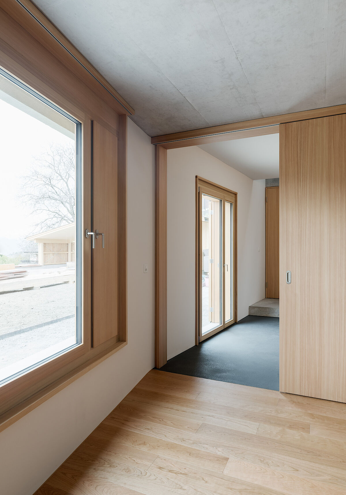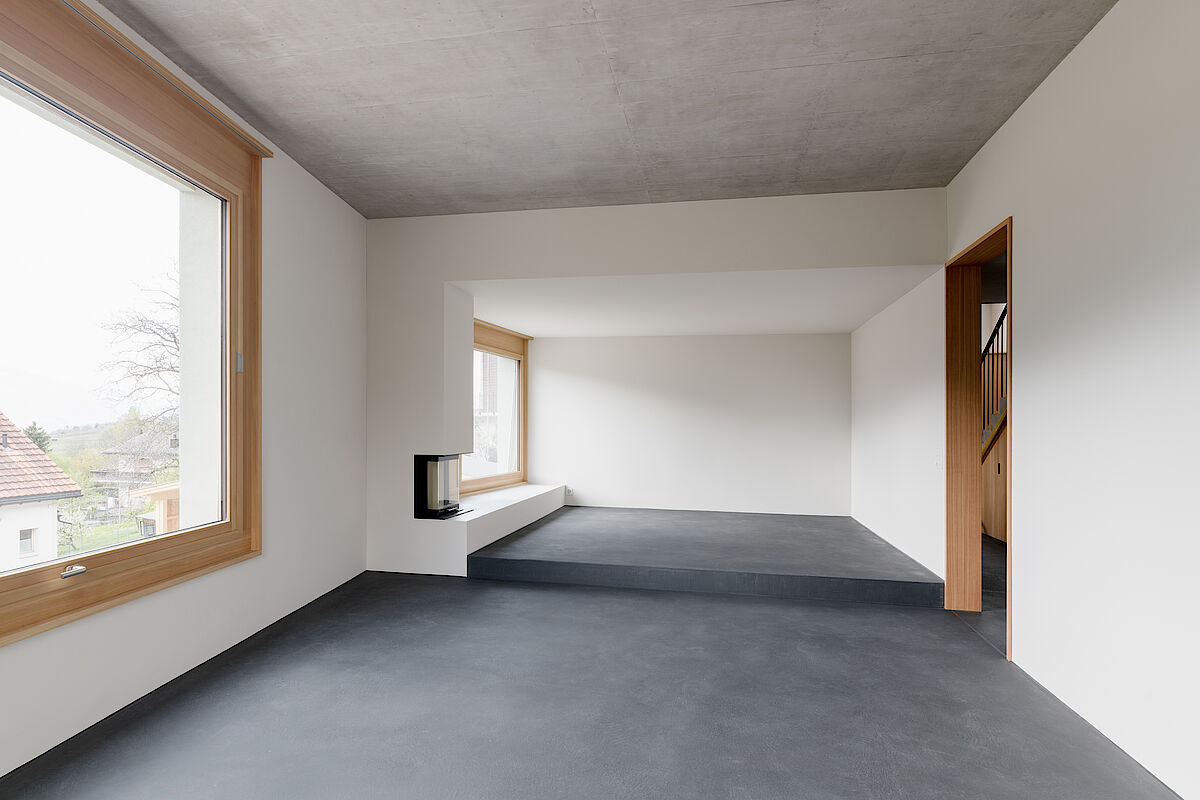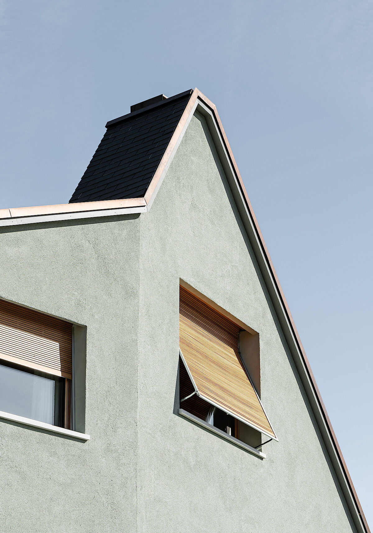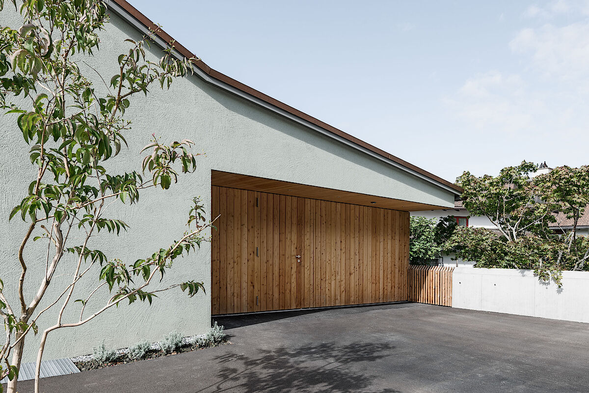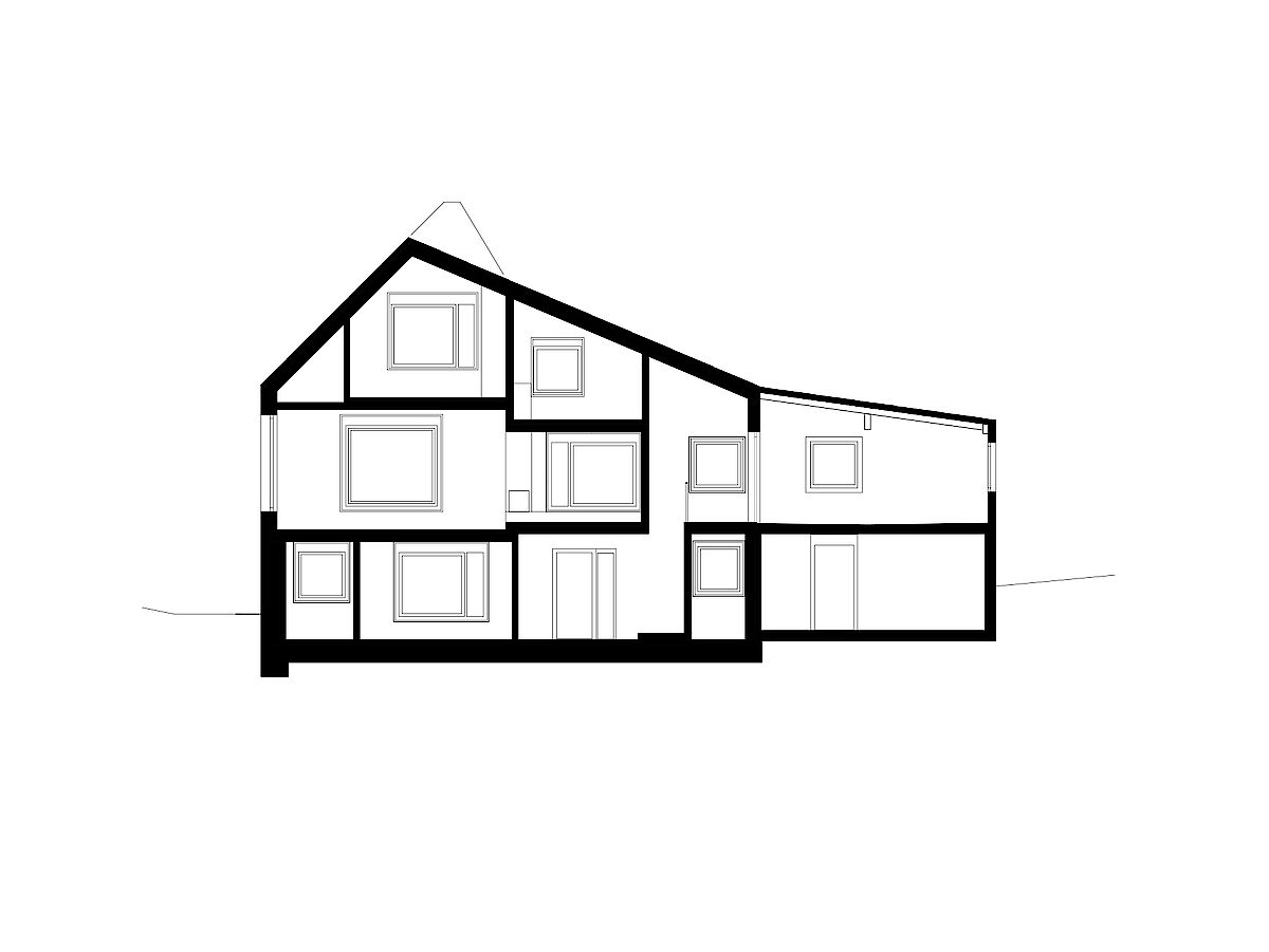 Am südlichen Dorfrand von Jenins gelegen, reiht sich das Wohnhaus selbstverständlich in die morphologische Dorfstruktur ein. Sämtliche Haupträume verfügen über einen malerischen Blick in die beeindruckende Landschaft. Die Hauptfassade wird durch eine leichte Abknickung gegliedert. Diese Massnahme ermöglicht Ausblicke aus dem Ess- und Wohnbereich Richtung Haldensteiner Calanda oder in die nahe gelegenen Rebhänge. Gleichzeitig verweist der Knick auch auf das Cheminée im Innern, welches mit der Fassade und dem ikonografischen Dach verschmilzt. Ein schmaler Aussenpool schliesst das Grundstück talseitig ab. Der zentrale Wohn-Essraum verfügt über grosse Panoramafenster. Anstelle eines zentralen Treppenhauses sind die einzelnen Geschosse und Zwischenniveaus durch Treppenfolgen oder wenige Stufen miteinander verbunden. Diese vielfältige Erschliessungsschicht beinhaltet aber auch funktionale Räume wie die Ankleide oder die Küche. Die Bescheidenheit im äusseren Ausdruck verbirgt einen grossen Reichtum im Inneren.
