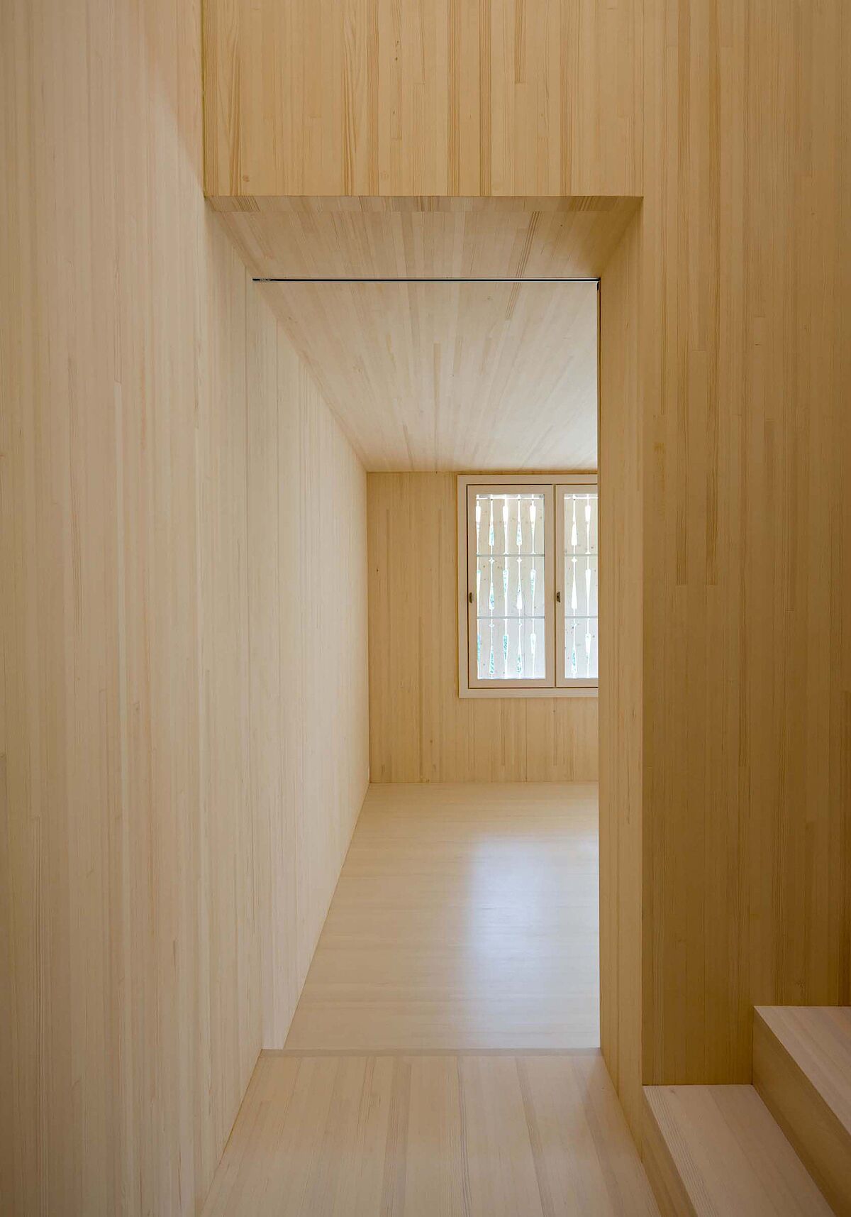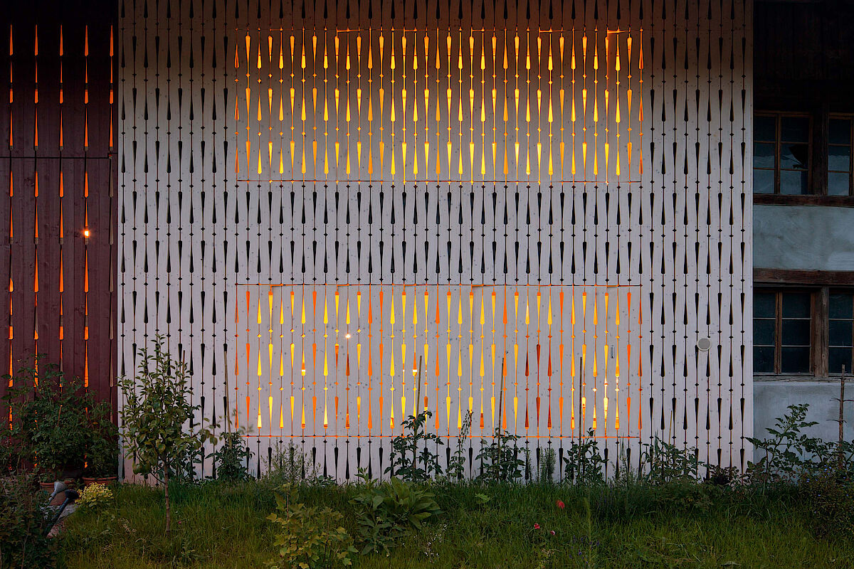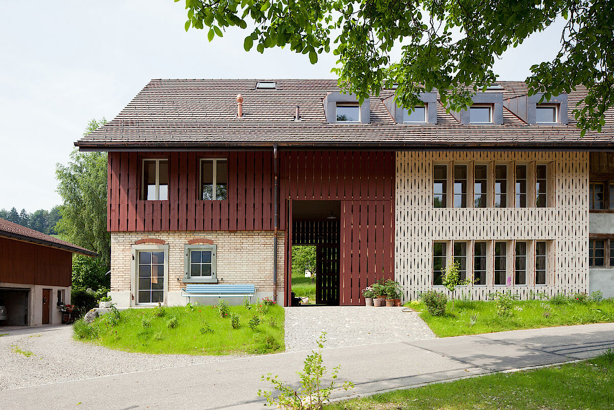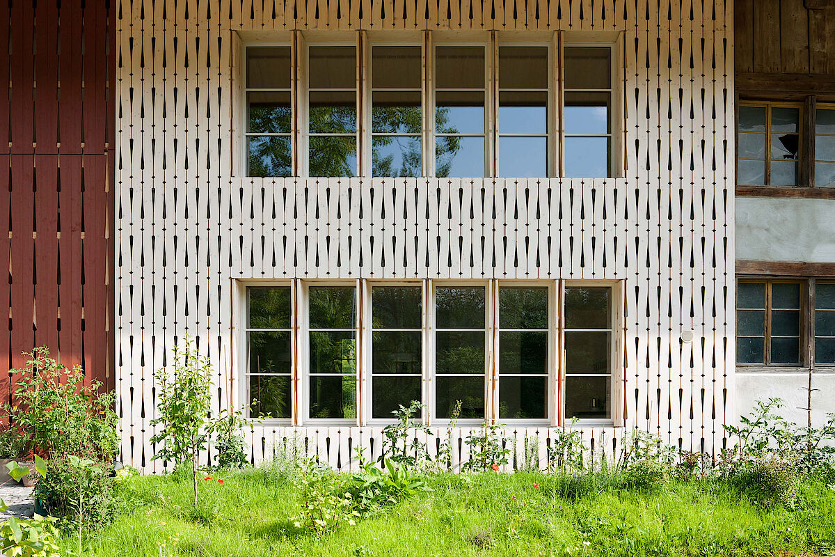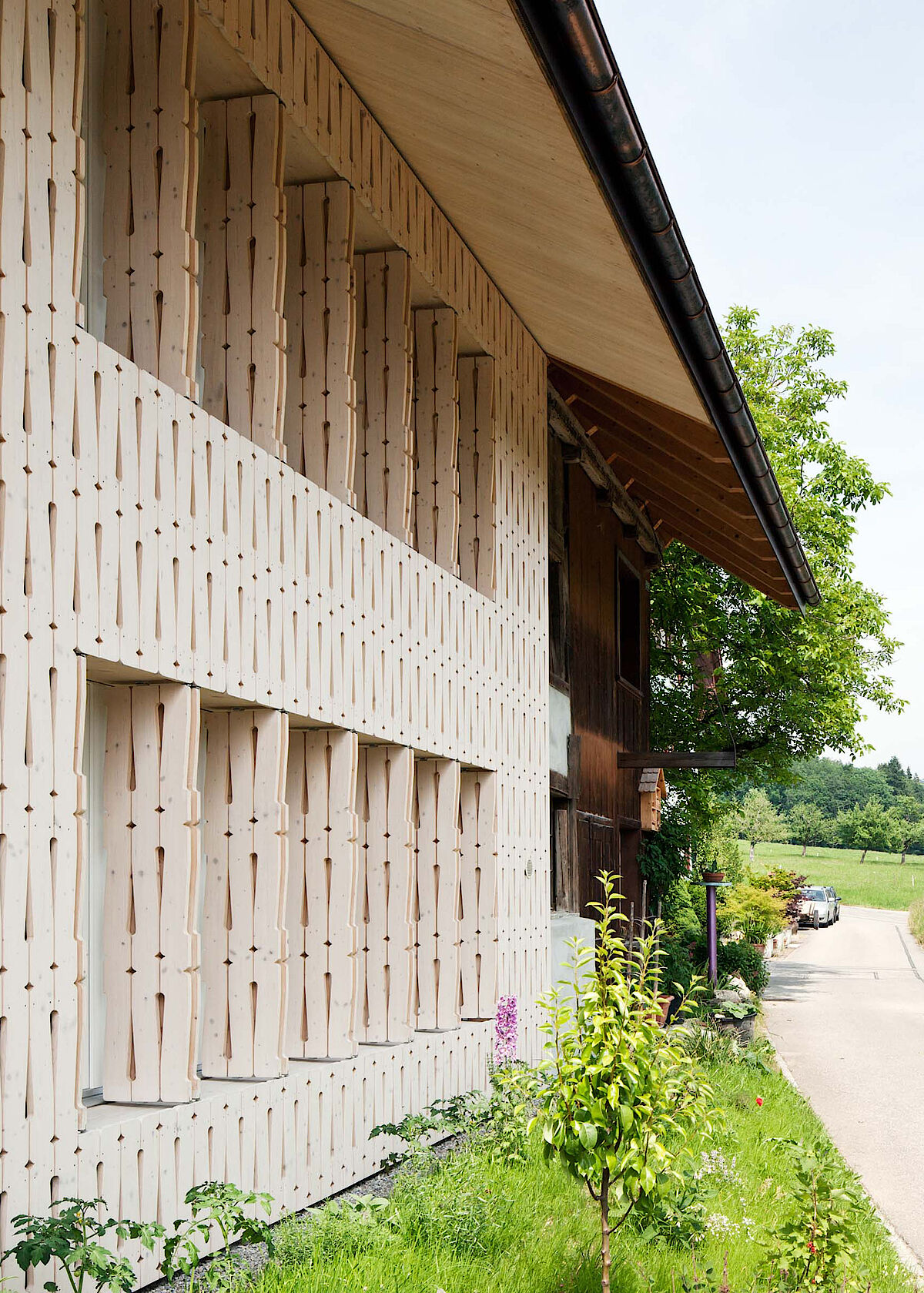 Das 1805 erbaute Gebäude, von welchem ein Teil als Stallscheune genutzt wurde, wird zu einem Haus für zwei Generationen umgebaut. Einzig erhalten bleibt eine Mauerwerkswand, die ehemals den Stall umgab. Das beizubehaltende Volumen wird mit massiven, vorgefertigten Holzelementen ausgebaut und mit einer Holzfassade bekleidet. Wie beim traditionellen Bauernhaus erhalten die Bretter an ihren Aussenseiten Schnitzereien, die in der Addition ein individuelles Muster ergeben. Beheizt wird das Haus über Hypocausten. Vom zentralen Ofen steigt die warme Luft über Heizwände bis ins Dachgeschoss. Um diesen massiven, wärmenden Kern entwickelt sich die vertikale Erschliessung. Die anderen Oberflächen des Hauses sind gesamthaft in Fichtenholz gehalten, so dass der Eindruck einer textilen Haut entsteht.
