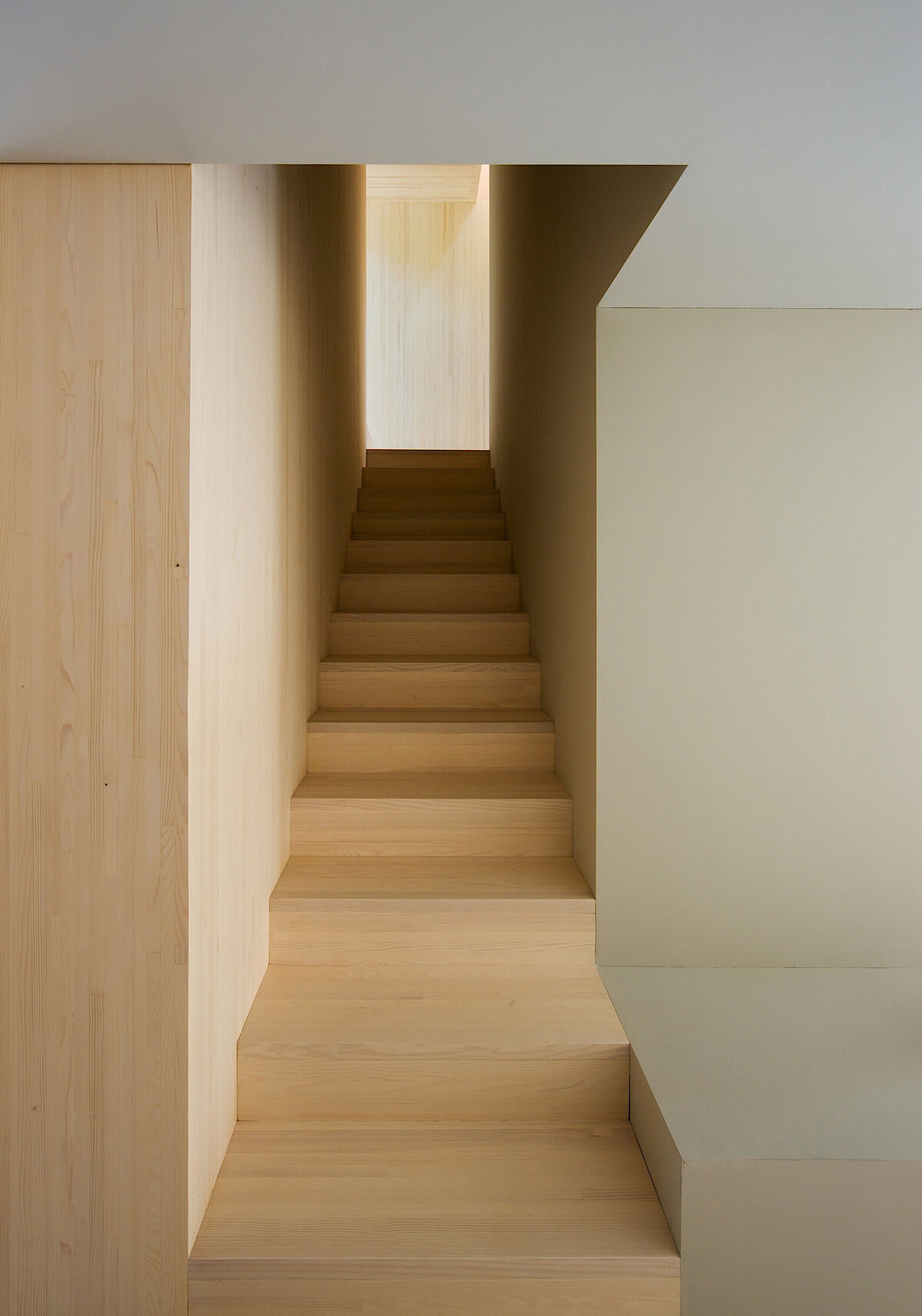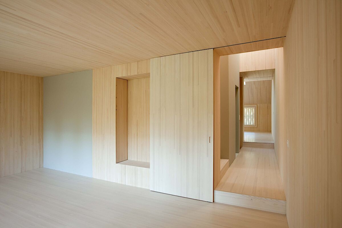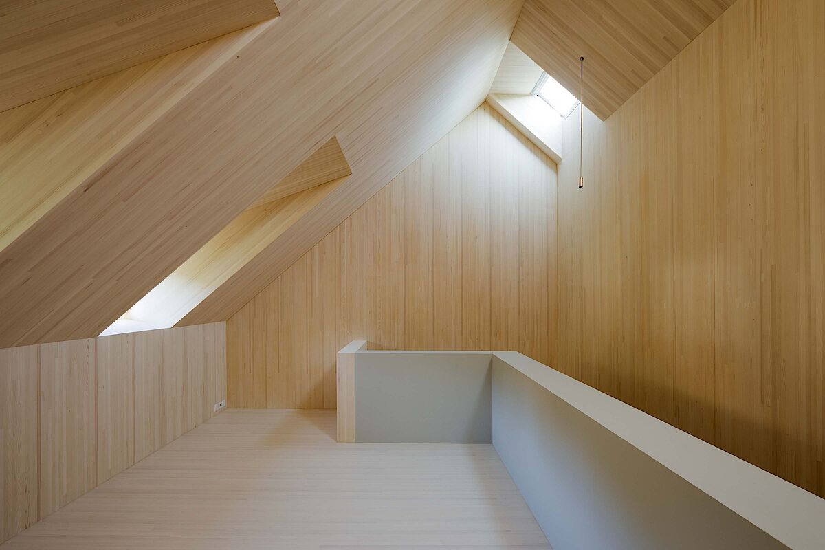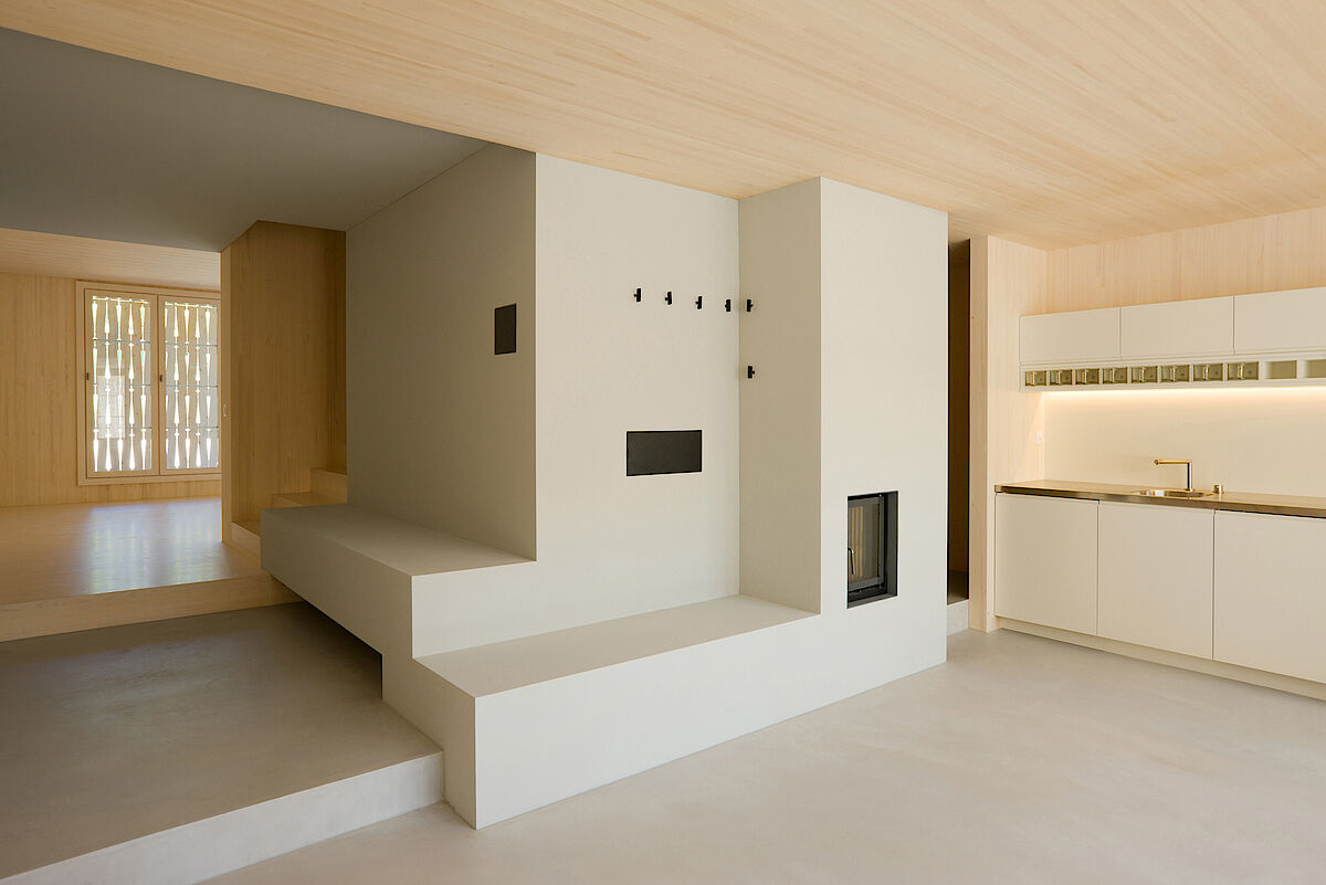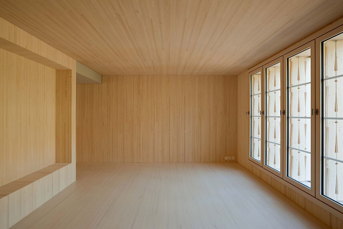 Das 1805 erbaute Gebäude, von welchem ein Teil als Stallscheune genutzt wurde, wird zu einem Haus für zwei Generationen umgebaut. Einzig erhalten bleibt eine Mauerwerkswand, die ehemals den Stall umgab. Das beizubehaltende Volumen wird mit massiven, vorgefertigten Holzelementen ausgebaut und mit einer Holzfassade bekleidet. Wie beim traditionellen Bauernhaus erhalten die Bretter an ihren Aussenseiten Schnitzereien, die in der Addition ein individuelles Muster ergeben. Beheizt wird das Haus über Hypocausten. Vom zentralen Ofen steigt die warme Luft über Heizwände bis ins Dachgeschoss. Um diesen massiven, wärmenden Kern entwickelt sich die vertikale Erschliessung. Die anderen Oberflächen des Hauses sind gesamthaft in Fichtenholz gehalten, so dass der Eindruck einer textilen Haut entsteht.