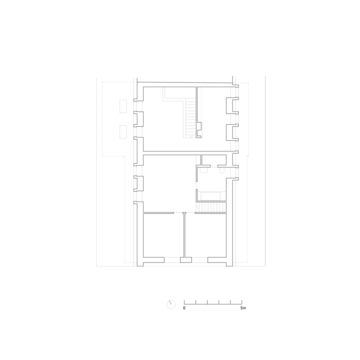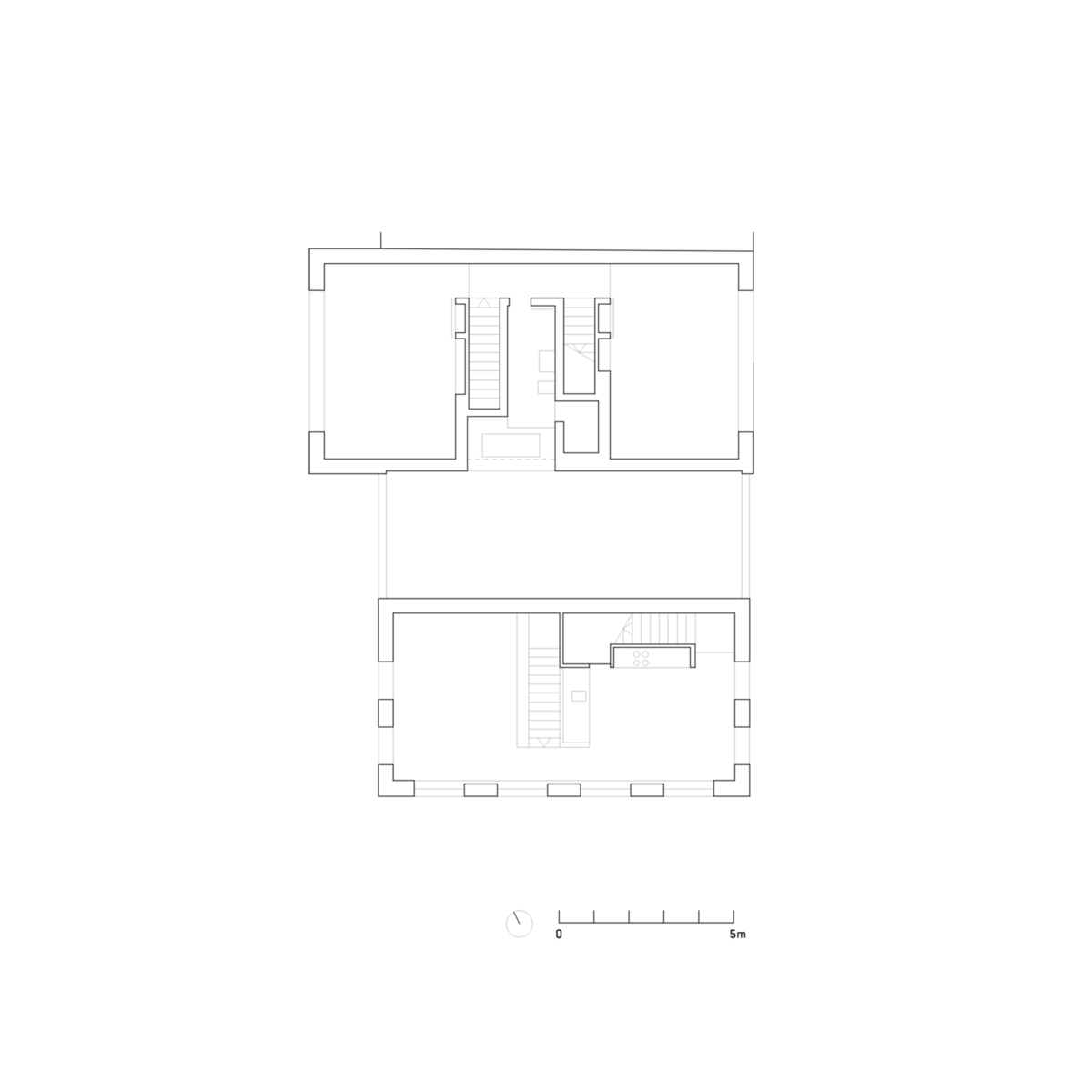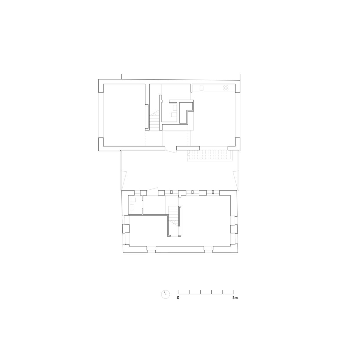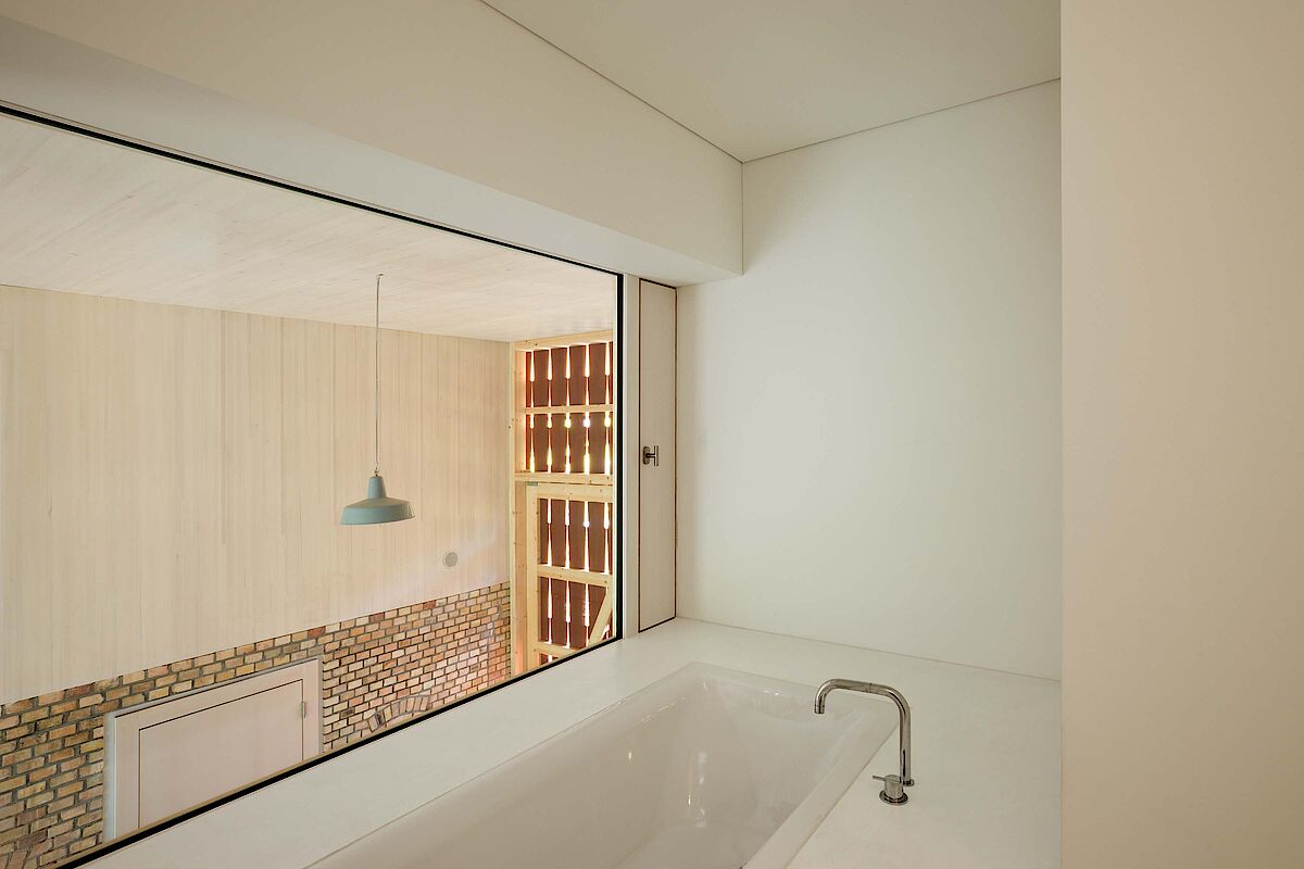 Das 1805 erbaute Gebäude, von welchem ein Teil als Stallscheune genutzt wurde, wird zu einem Haus für zwei Generationen umgebaut. Einzig erhalten bleibt eine Mauerwerkswand, die ehemals den Stall umgab. Das beizubehaltende Volumen wird mit massiven, vorgefertigten Holzelementen ausgebaut und mit einer Holzfassade bekleidet. Wie beim traditionellen Bauernhaus erhalten die Bretter an ihren Aussenseiten Schnitzereien, die in der Addition ein individuelles Muster ergeben. Beheizt wird das Haus über Hypocausten. Vom zentralen Ofen steigt die warme Luft über Heizwände bis ins Dachgeschoss. Um diesen massiven, wärmenden Kern entwickelt sich die vertikale Erschliessung. Die anderen Oberflächen des Hauses sind gesamthaft in Fichtenholz gehalten, so dass der Eindruck einer textilen Haut entsteht.