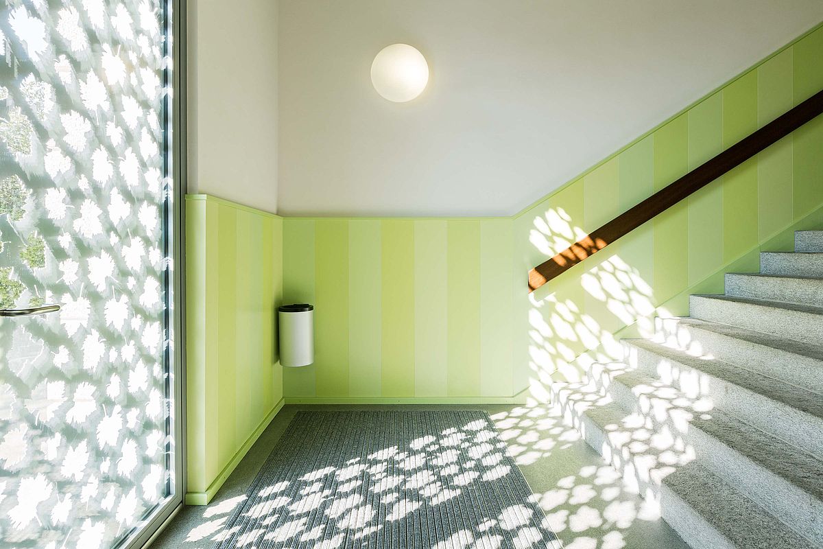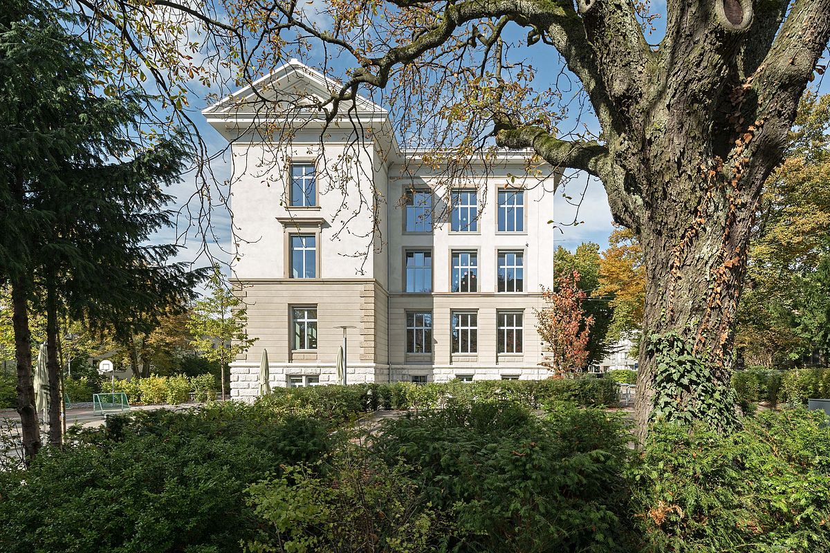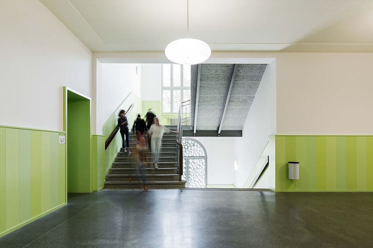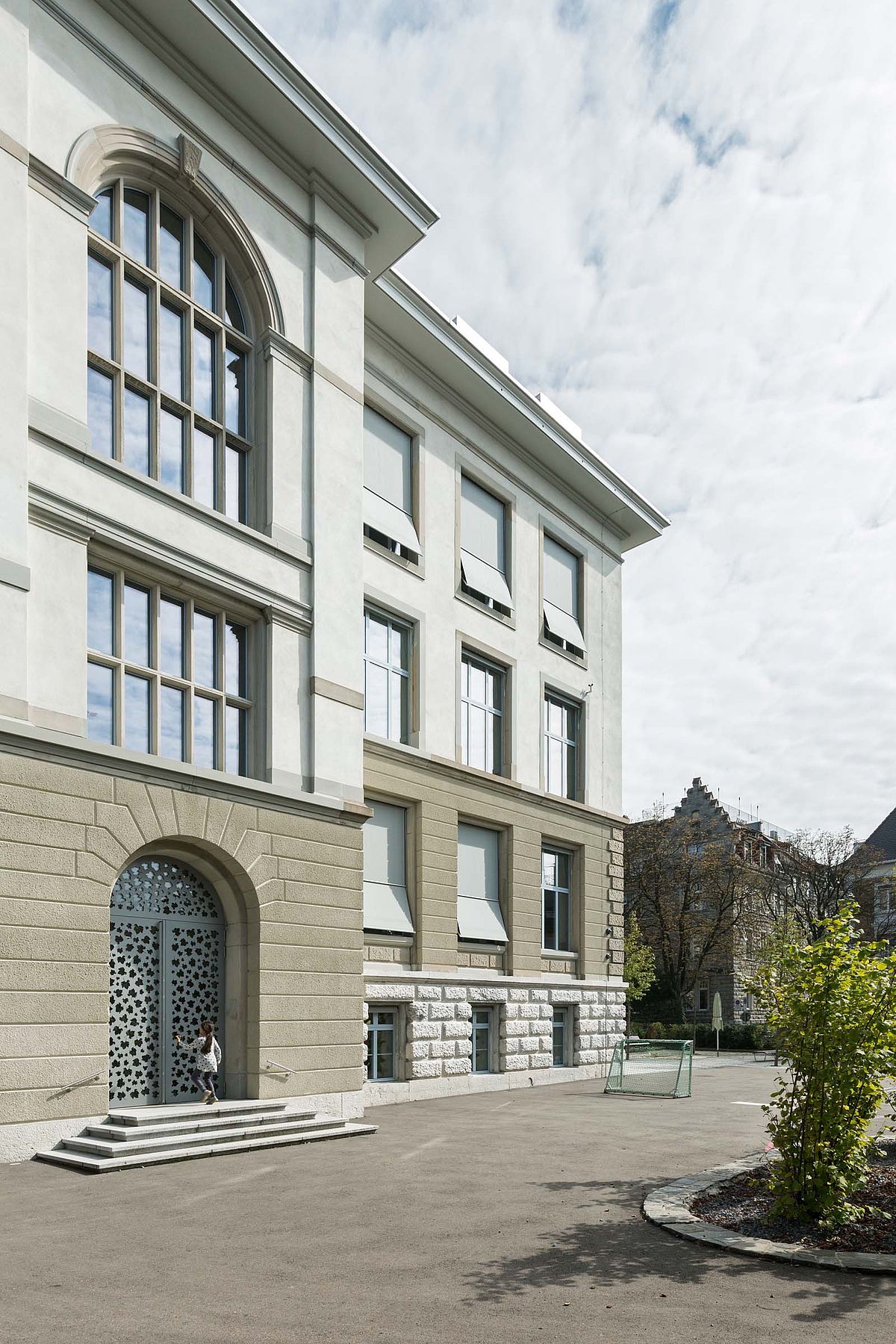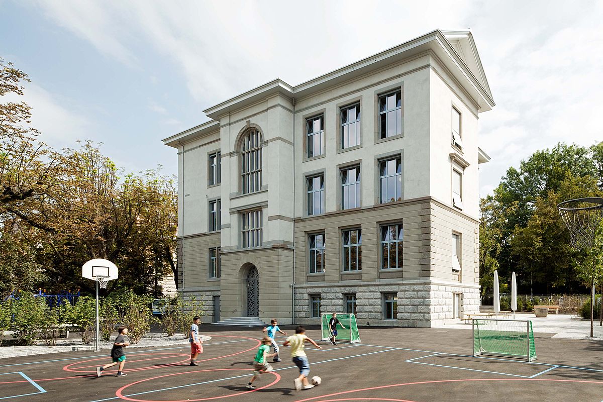 Neben der Instandsetzung des spätklassizistischen Schulgebäudes soll ein Hort im Tiefparterre eingebaut sowie das Dach mit einem Mehrzwecksaal ergänzt werden. Das Aufgreifen alter Ideen und ihre Reinterpretation beschreibt die Vorgehensweise bei der Instandsetzung des um 1891 erbauten Schulhauses. So werden Elemente wie zum Beispiel das Brusttäfer, welche früheren Renovation zum Opfer gefalle wurden, im Treppen- und Erschliessungsraum wieder eingeführt. Das neue in Grüntönen gehaltene Wandtäfer zieht sich mäanderartig durch das gesamte Haus und bringt die verloren gegangene Massstäblichkeit wieder zurück. Im ausgebauten Dachgeschoss erschliesst ein umlaufender Umgang den neuen Mehrzweckraum. Der in feinen Holzlamellen bekleidete Saal ist geprägt durch den neuen kleinteilig gefalteten Dachabschluss. Die Lichtstimmung im hölzernen Mehrzweckraum wird durch nach Norden gerichtete Oberlichter bestimmt.