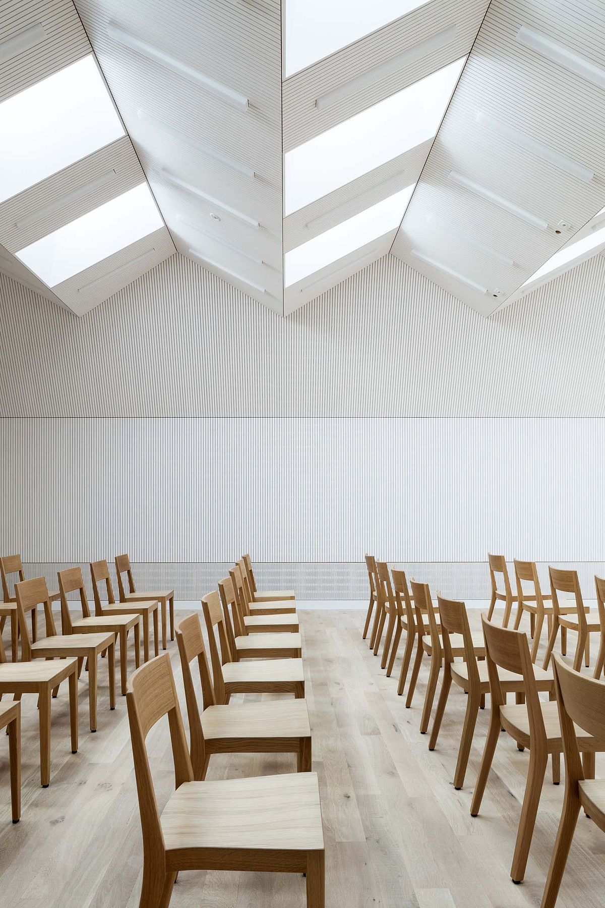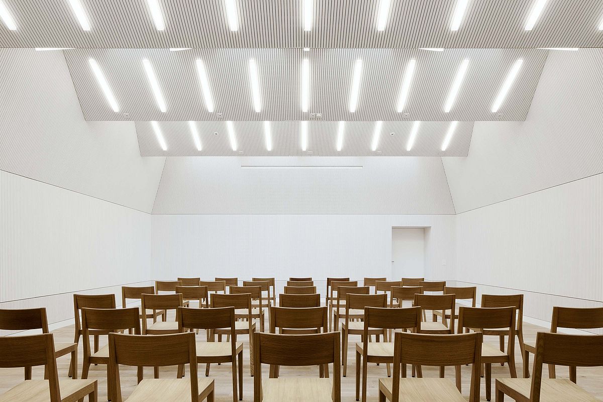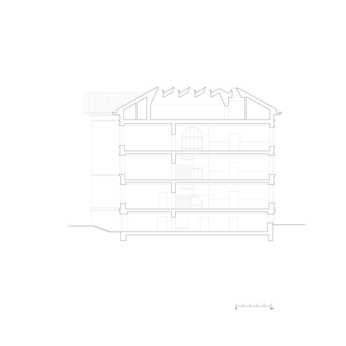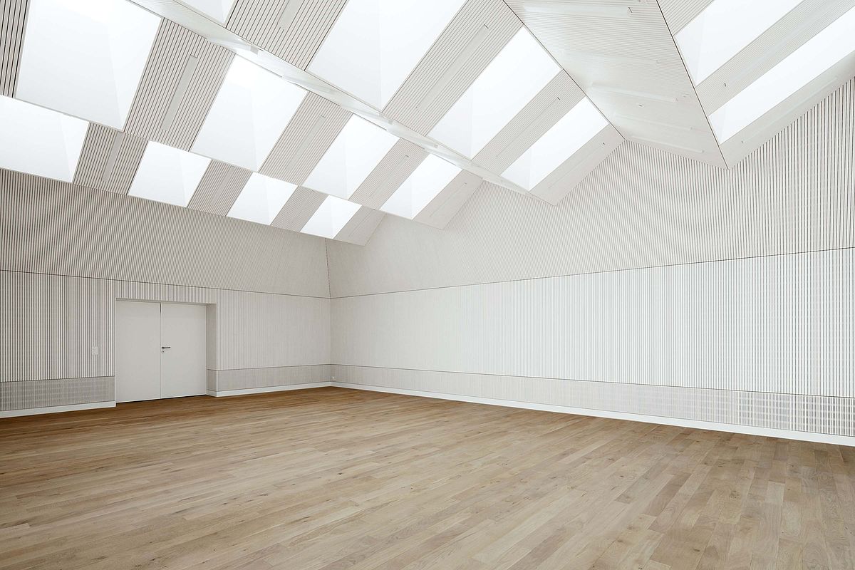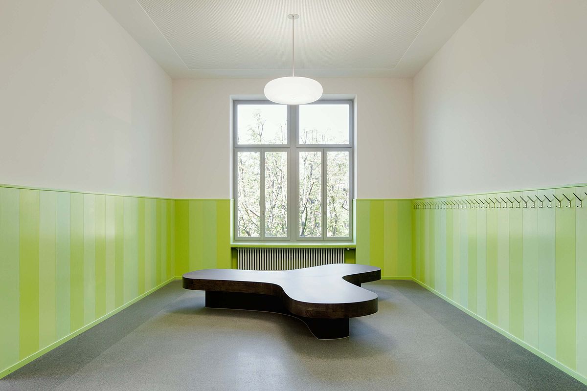 Neben der Instandsetzung des spätklassizistischen Schulgebäudes soll ein Hort im Tiefparterre eingebaut sowie das Dach mit einem Mehrzwecksaal ergänzt werden. Das Aufgreifen alter Ideen und ihre Reinterpretation beschreibt die Vorgehensweise bei der Instandsetzung des um 1891 erbauten Schulhauses. So werden Elemente wie zum Beispiel das Brusttäfer, welche früheren Renovation zum Opfer gefalle wurden, im Treppen- und Erschliessungsraum wieder eingeführt. Das neue in Grüntönen gehaltene Wandtäfer zieht sich mäanderartig durch das gesamte Haus und bringt die verloren gegangene Massstäblichkeit wieder zurück. Im ausgebauten Dachgeschoss erschliesst ein umlaufender Umgang den neuen Mehrzweckraum. Der in feinen Holzlamellen bekleidete Saal ist geprägt durch den neuen kleinteilig gefalteten Dachabschluss. Die Lichtstimmung im hölzernen Mehrzweckraum wird durch nach Norden gerichtete Oberlichter bestimmt.