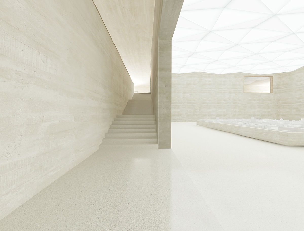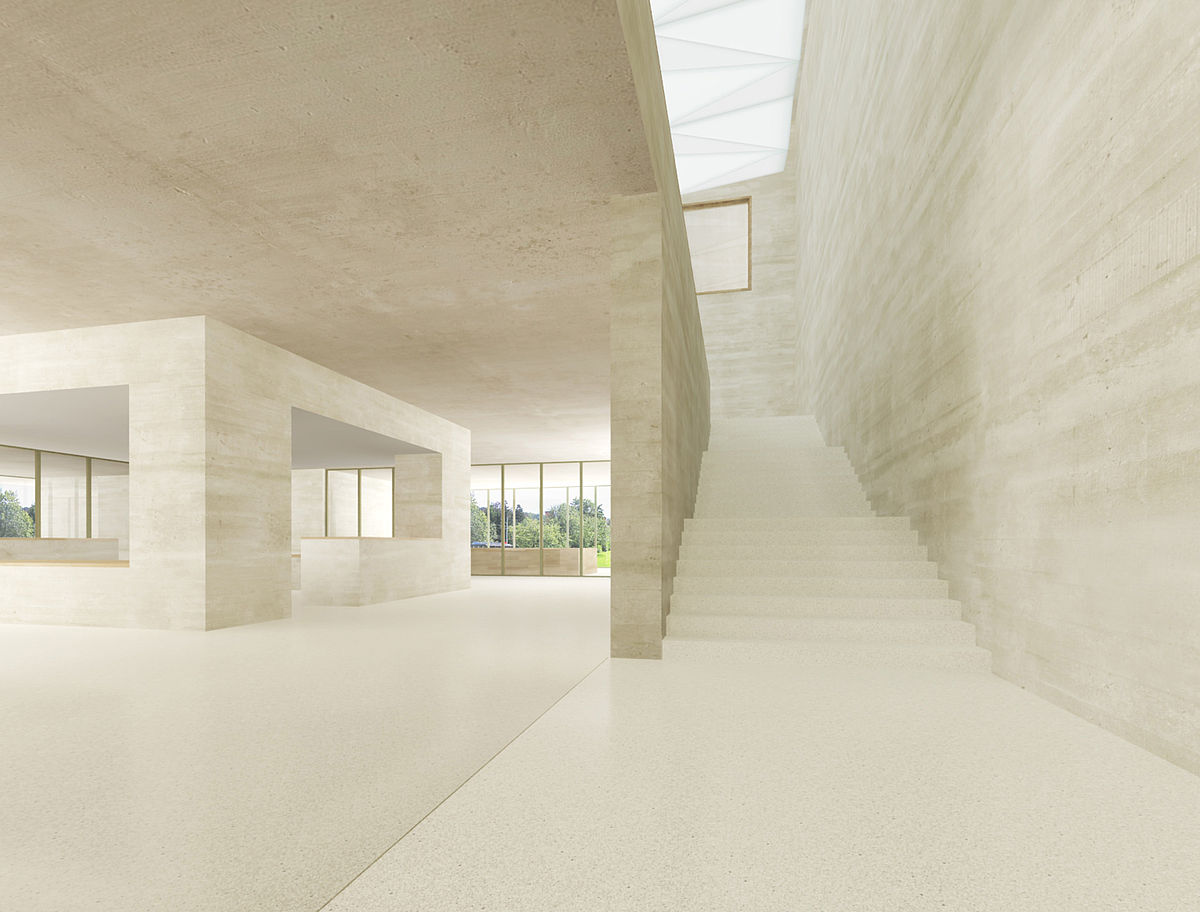Einläufige Treppen verbinden Foyer und die Ausstellungsräume mit dem Herzstück des Hauses: ein überhoher Raum, welcher in Analogie zum kristallinen Inneren eines ausgehöhlten Steins ausgebildet ist. Gezielte Aus- und Rückblicke begleiten den Weg durchs Haus.