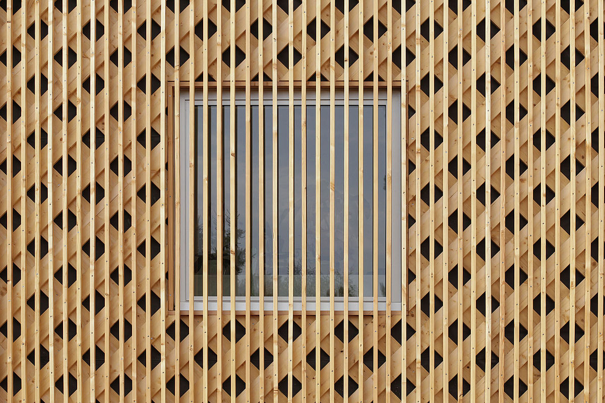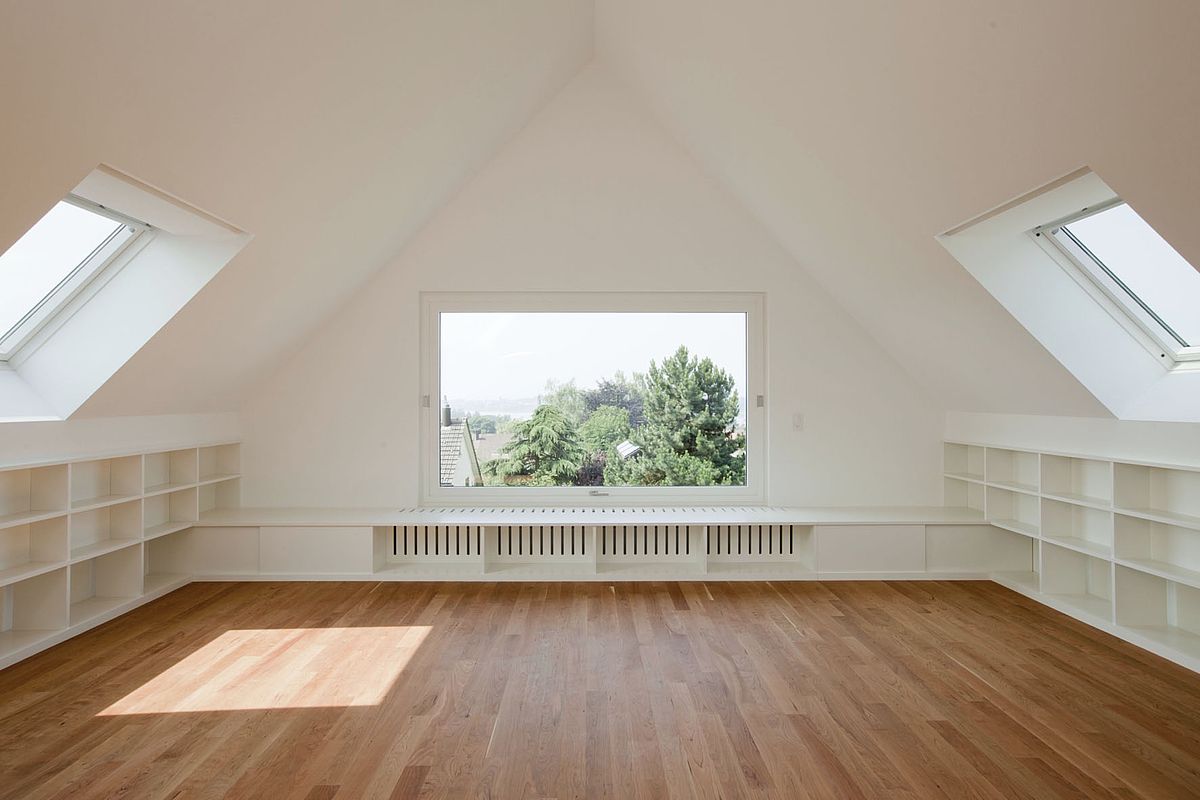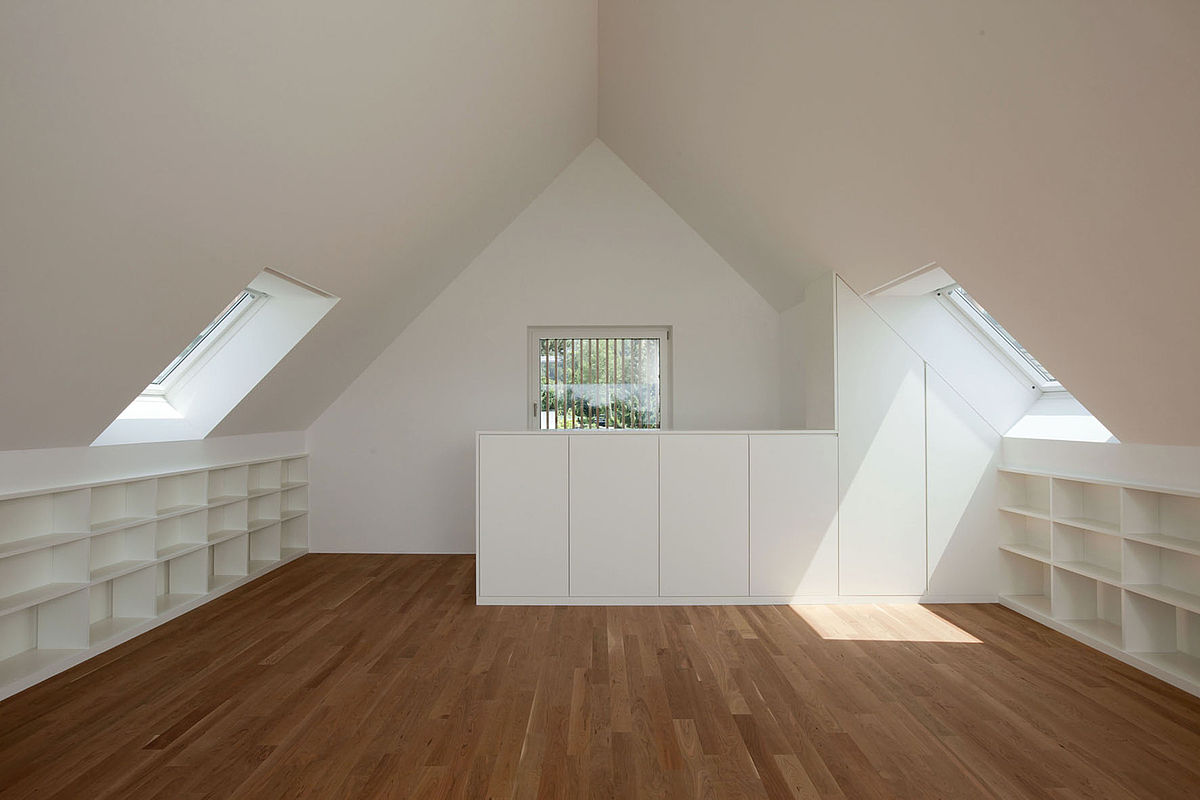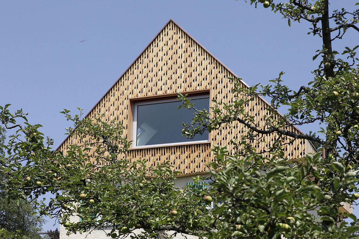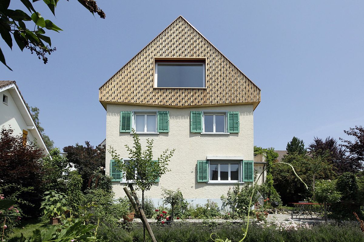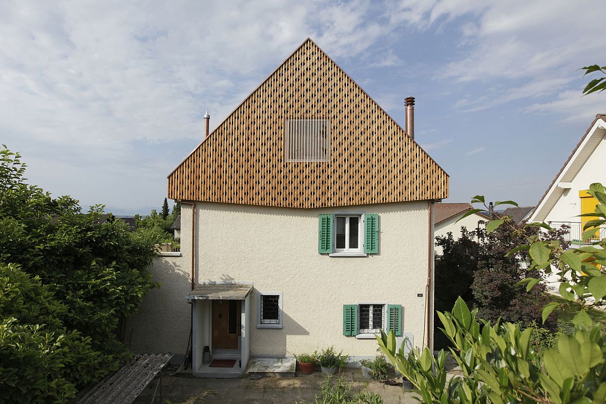 Unter einem flach geneigten Giebeldach befand sich nur ein kleiner Estrichraum, welcher durch einen neuen Aufbau in Form eines steilen Giebeldachhutes ersetz wurde. Der geometrisch eigenständige Dachaufbau wird in Holzelementbauweise vorfabriziert und ruht sozusagen auf dem bestehenden muralen „Sockelvolumen“. Die Fassadenhaut bildet sich aus einer gekreuzten Tannenbretterverschalung und einer vertikalen Lärchenstablatte. Die Zugangsseite im Norden zeigt sich eher verschlossen zu den nahestehenden Nachbarbauten, erst in der Frontalansicht wird die kleine Öffnung im hutartigen Aufbau sichtbar. Das als ein offener Bibliotheksraum ausgebaute Dachgeschoss gewährt mit einem grossen Schwingflügelfenster im Süden einen malerischen Ausblick über den Pfäffikersee in die Alpen.