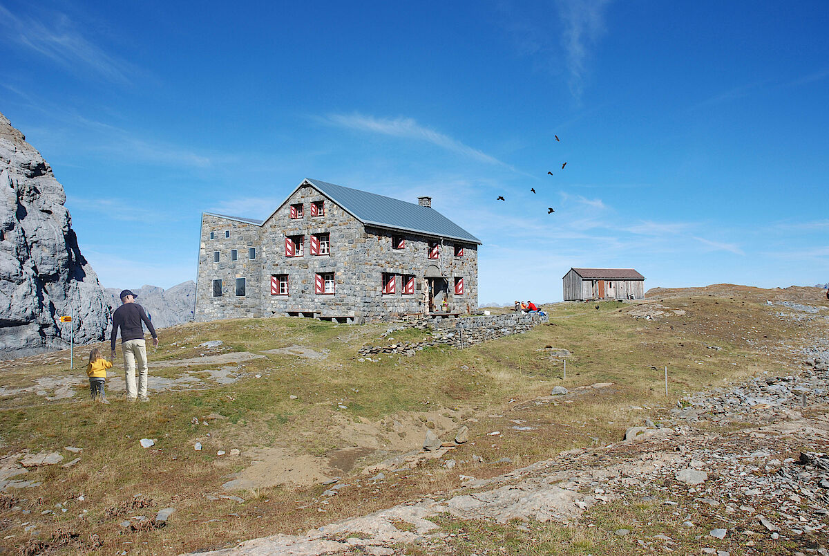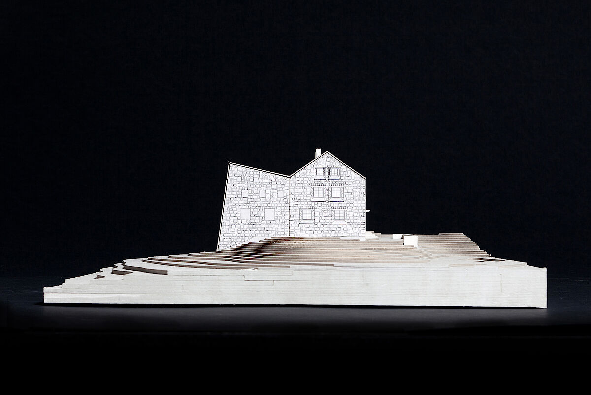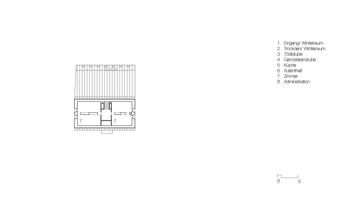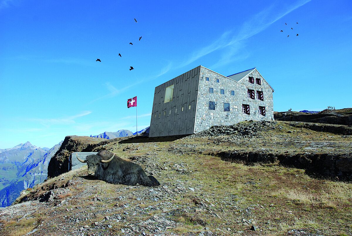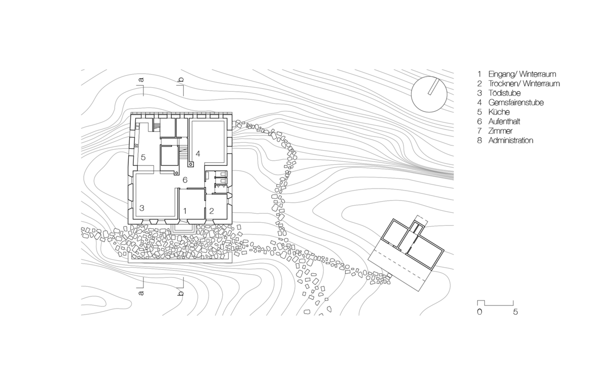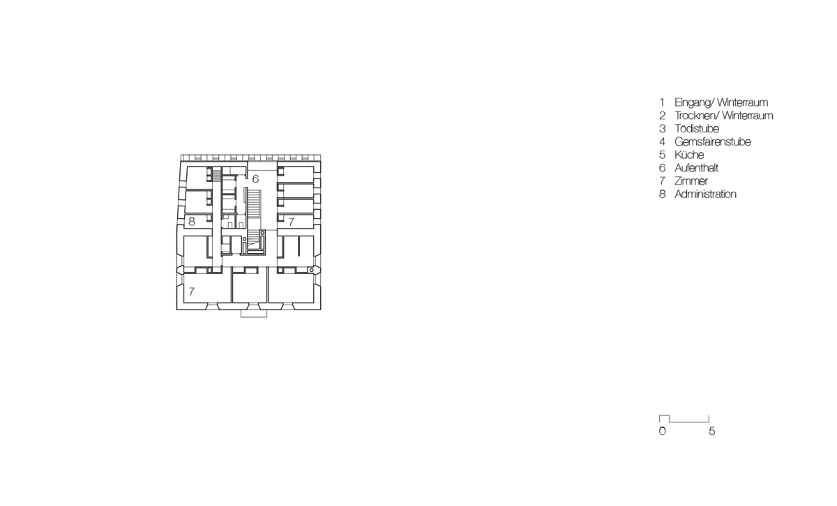 Die 1942 erbaute SAC-Hütte soll im Zuge einer Gesamtsanierung und einer Erweiterung den aktuellen Bedürfnissen angepasst werden. Der Ausdruck der als Steintypus errichteten Claridenhütte verändert sich durch den Anbau je nach Perspektive. Während des Aufstiegs vom Fisetengrat präsentiert sie sich in einem neuen Gesicht; nähert man sich der Hütte an, erkennt man die gewohnte Erscheinung. Aus dem bestehenden Volumen entwickelt sich an der Nordseite ein zweites asymmetrisches Dach, welches steil abfallend zum Boden geführt wird. Der massive, expressive Körper verortet sich im Bergmassiv und erscheint als architektonischer Teil der Berglandschaft. Der Ausdruck der als Steintypus errichteten Claridenhütte verändert sich durch den Anbau je nach Sichtperspektive. Die neue, markante nordseitige Dachfläche, bestückt mit einem “wachenden“ Auge in Form eines Panoramafensters, begleitet die Berggänger beim Aufstieg über den Fosetengrat. Beim Annähern an die Hütte tritt der Erweiterungsteil immer mehr in den Hintergrund, sodass den Besucher schliesslichdas vertraute Bildder “alten“ Claridenhütte empfängt.