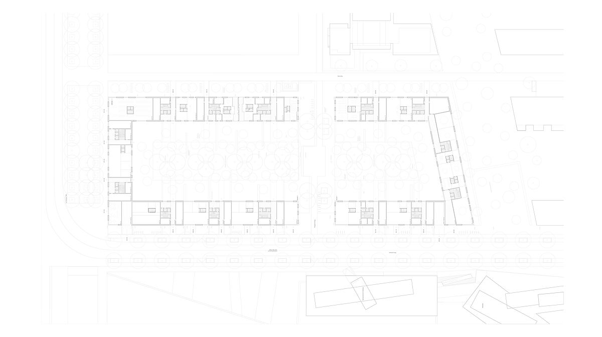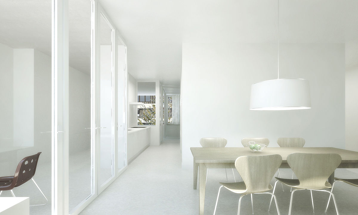 Der neu entstehende Stadtteil Bern Brünnen ist besonders geprägt durch das expressiv gestaltete Einkaufszentrum „West Side“. Die neue Randbebauung präzisiert den Strassenraum und lässt einen halb privaten, grossflächigen Hof entstehen. Dieser identitätsstiftende Wohnhof vermag die heutigen Ansprüche eines Wohnens zwischen Stadt und Land zu erfüllen. Charakteristisch für den Entwurf sind die Loggien, welche sich über die gesamte Tiefe des Grundrisses erstrecken. Die energetisch effizienten, als Wintergärten ausformulierten Aussenräume lassen ein Maximum an Privatsphäre und individueller Besetzung zu. Als Gelenk zwischen Innen und Aussen fungiert die Küche, die zwischen den öffentlichen Räumen gesetzt ist. Die Nutzungen der Räume sind nicht präzisiert und können individuell angepasst werden.