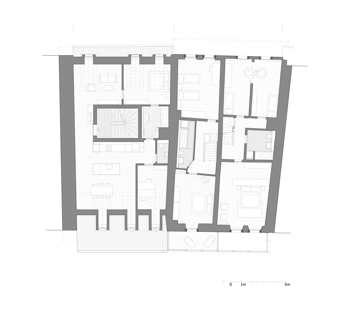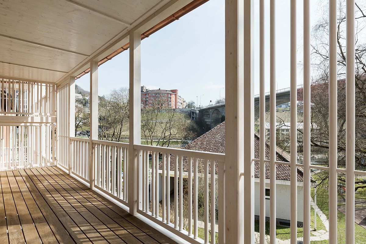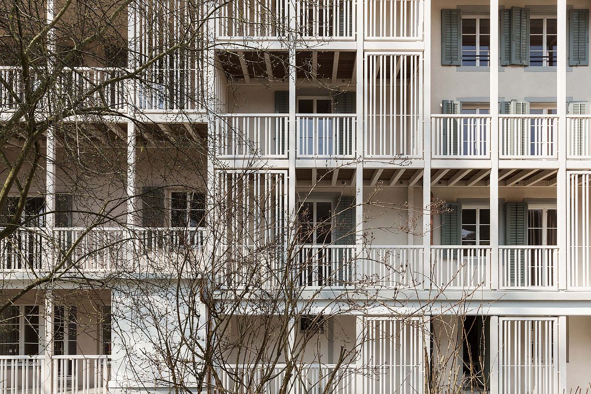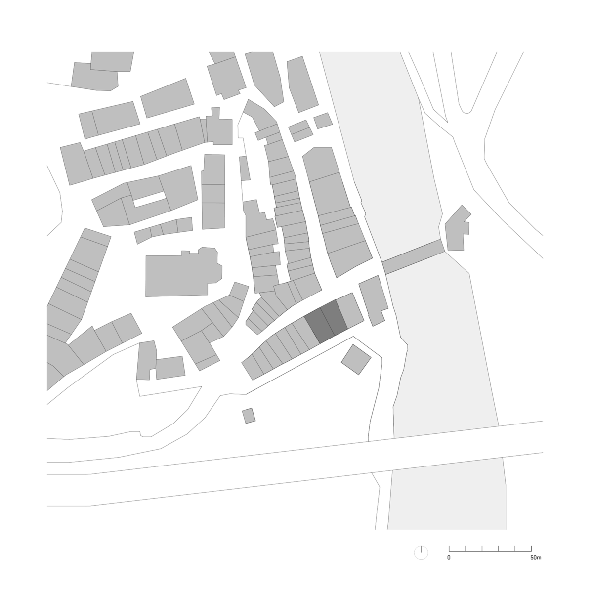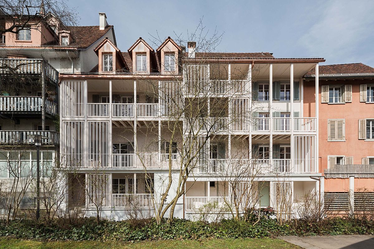 Am Rande der Badener Altstadt sollen zwei mittelalterliche Häuser Instand gesetzt werden. Besondere Anforderungen entstehen von Seiten des Denkmalschutzes, da eines der Gebäude auf der Liste der zu schützenden Objekte steht. Die äussere Gestalt bleibt auf Seite der Altstadt weitgehend erhalten. Der sich zur Limmat hin orientierenden Südseite wird eine Verandaschicht in filigraner Holzkonstruktion vorgestellt. So werden für die Wohnungen attraktive Aussenräume geschaffen, ohne in die Altbausubstanz der ehemaligen Stadtmauer einzugreifen. Die Verandaschicht ist differenziert ausgestaltet. Durch das in der Höhe variierende und verschieden dichte Staketengeländer kann die Intimität nach Bedarf eingestellt werden. Im Inneren wird die gegebene Struktur der Brandmauern angenommen und als Qualität für die verschiedenen Wohnungen herausgestellt.