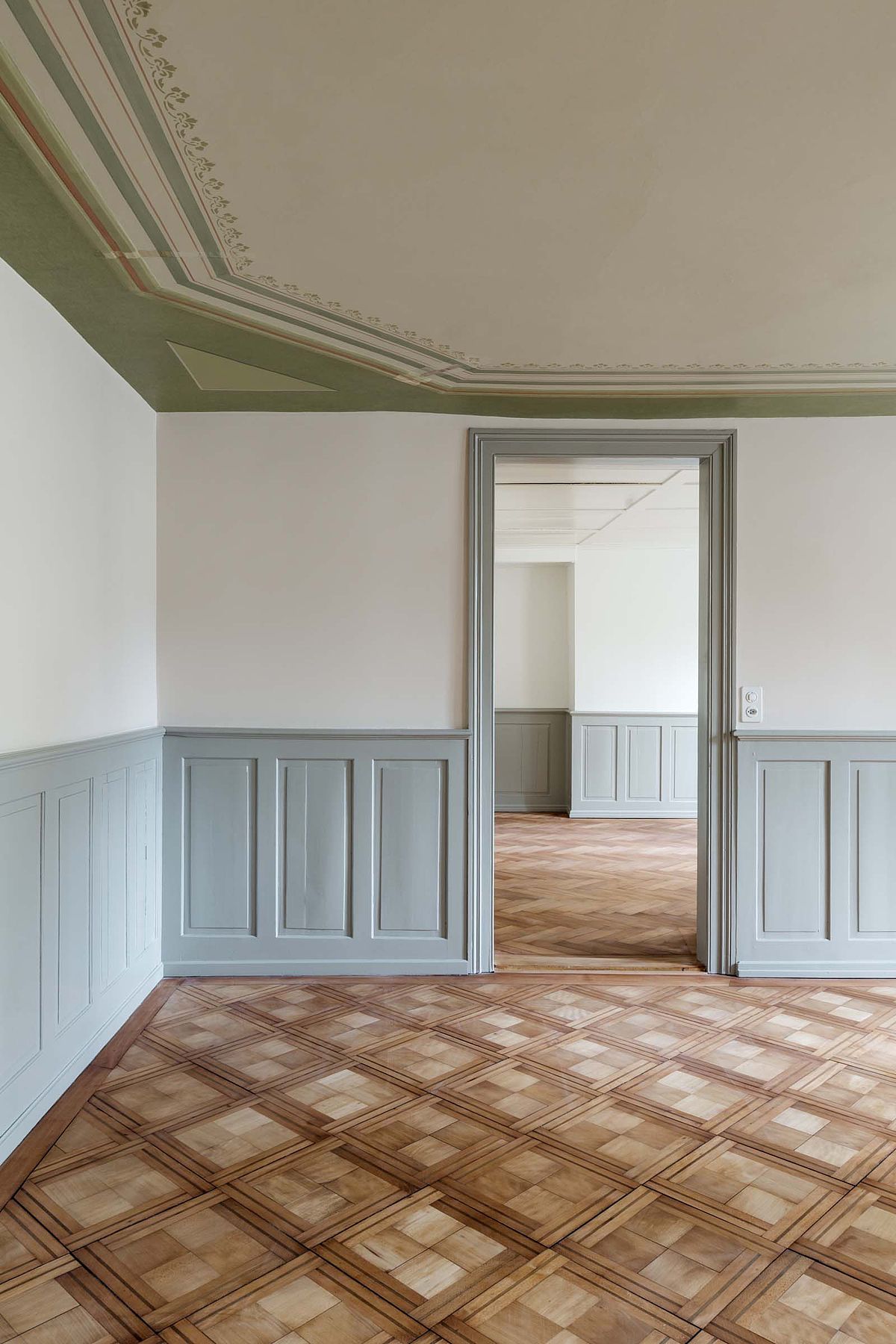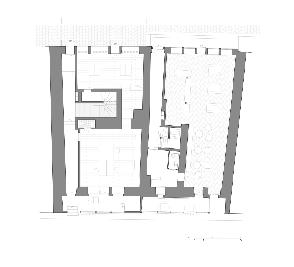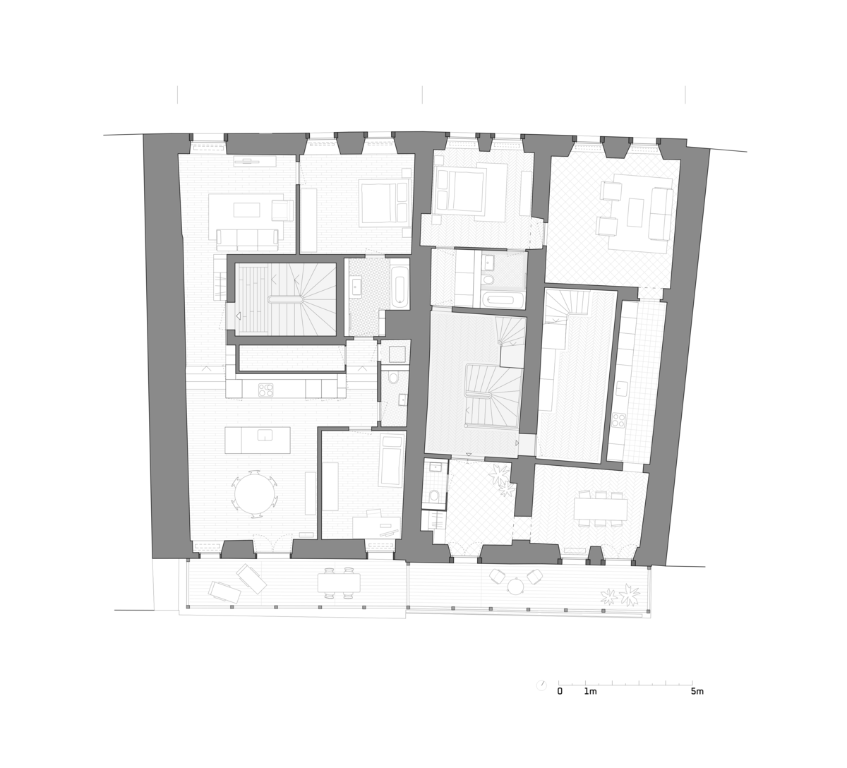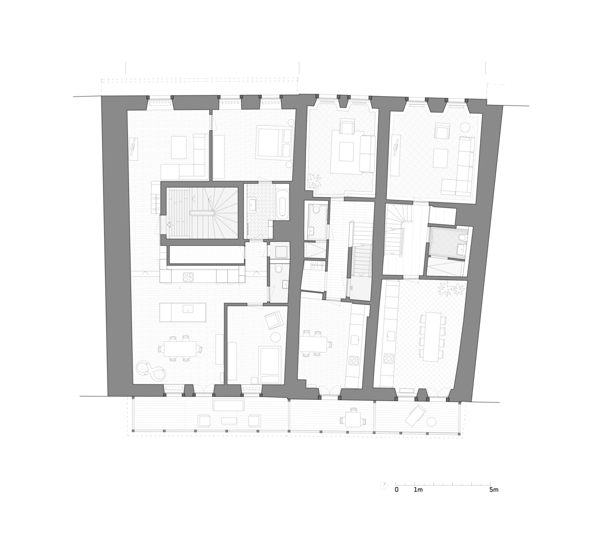 Am Rande der Badener Altstadt sollen zwei mittelalterliche Häuser Instand gesetzt werden. Besondere Anforderungen entstehen von Seiten des Denkmalschutzes, da eines der Gebäude auf der Liste der zu schützenden Objekte steht. Die äussere Gestalt bleibt auf Seite der Altstadt weitgehend erhalten. Der sich zur Limmat hin orientierenden Südseite wird eine Verandaschicht in filigraner Holzkonstruktion vorgestellt. So werden für die Wohnungen attraktive Aussenräume geschaffen, ohne in die Altbausubstanz der ehemaligen Stadtmauer einzugreifen. Die Verandaschicht ist differenziert ausgestaltet. Durch das in der Höhe variierende und verschieden dichte Staketengeländer kann die Intimität nach Bedarf eingestellt werden. Im Inneren wird die gegebene Struktur der Brandmauern angenommen und als Qualität für die verschiedenen Wohnungen herausgestellt.