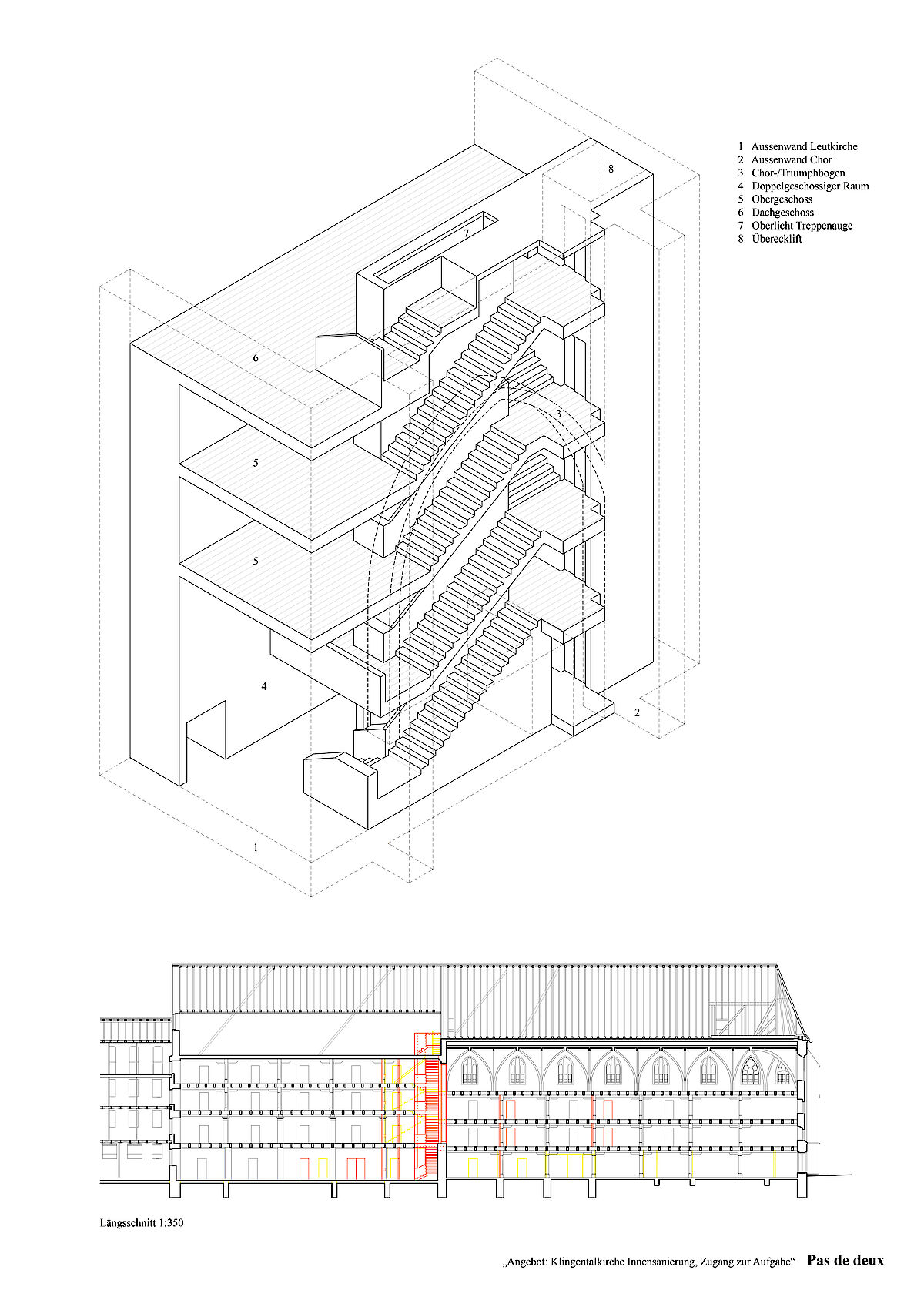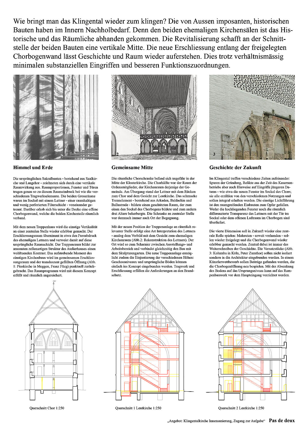 Wie bringt man das Klingental wieder zum klingen? Die von Aussen imposanten, historischen Bauten haben im Innern Nachholbedarf. Denn den beiden ehemaligen Kirchensälen ist das Historische und das Räumliche abhanden gekommen. Die Revitalisierung schafft an der Schnittstelle der beiden Bauten eine vertikale Mitte. Die neue Erschliessung entlang der freigelegten Chorbogenwand lässt Geschichte und Raum wieder auferstehen. Dies trotz verhältnismässig minimalen substanziellen Eingriffen und besseren Funktionszuordnungen.
