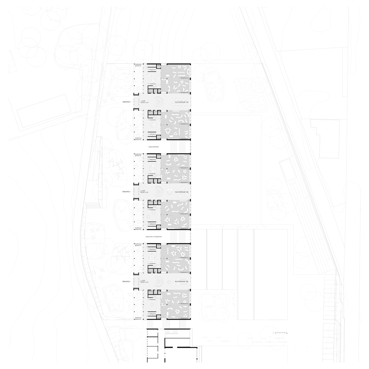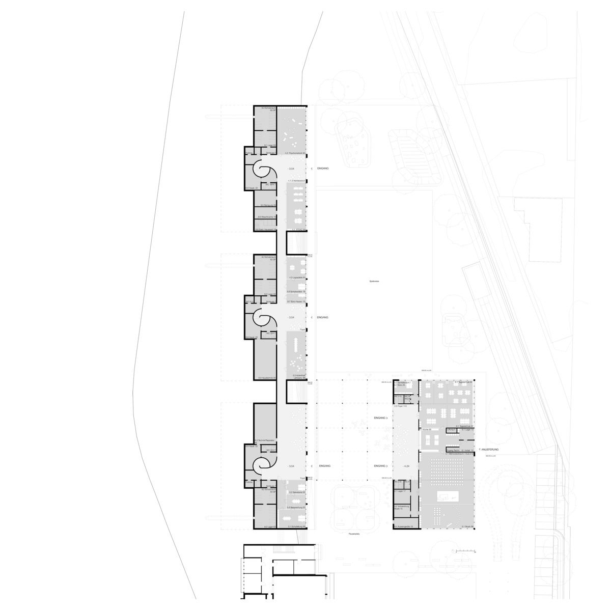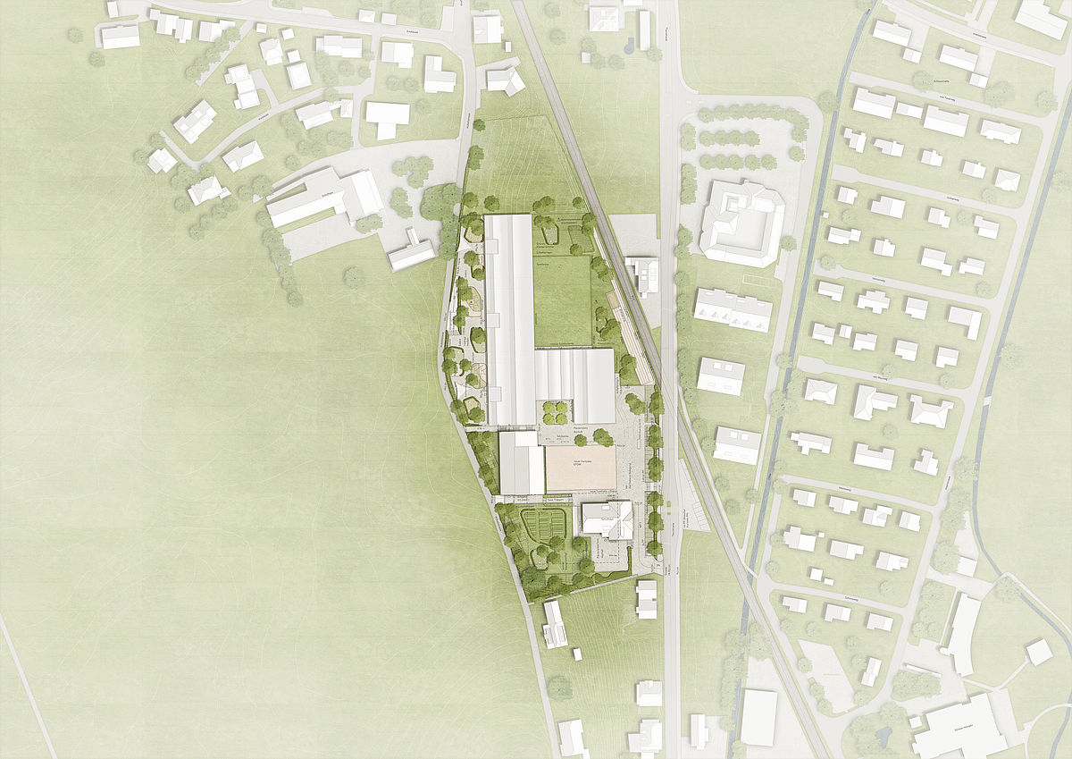Das für die neue Schullandschaft Stalden vorgesehene Areal Hübeli liegt etwas südlich vom Dorfkern von Konolfingen. Der Projektperimeter grenzt nördlich und südlich an bestehende Wohnbebauungen. Gegen Osten begrenzen die Bahnlinie Richtung Thun sowie die Thunstrasse die Parzelle. Im Westen bildet die höher gelegene Hübelistrasse den Abschluss zum Areal. Die neue Schule transformiert den bereits vorhandenen Schulstandort alleine schon aufgrund des grossen Raumprogrammes in einen anderen Massstab im Quartier ohne jedoch fremd und monumental zu erscheinen. Vielmehr ordnet sich die städtebauliche Setzung übergeordnet in das Muster der landschaftsprägenden Industrie- und Infrastrukturbauten entlang der Talsohlen von Konolfingen ein. Das neue Schulhaus artikuliert sich über ein zwei- bzw. dreigeschossiges langes, parallel zum Hang situiertes Volumen nahe der Hübelistrasse. Das kleinere eingeschossige Aula- und Tagesschulgebäude besetzt zusammen mit dem gebäudeverbindenden Pausendach die Mitte des Grundstückes. Durch die topographisch unterschiedlich gesetzten und ausgerichteten Volumen werden je eigene Adressierungen zur Hübeli- und Thunstrasse markiert. Der zentral gelegene offene und gedeckte Pausenplatzbereich bildet das erkennbare und lebendige Zentrum der Schule und verbindet in alle Richtungen die unterschiedlich ausformulierten Aussenräume. Die ortsbauliche Setzung verknüpft auf selbstverständliche Art und Weise Bestehendes und Neues.